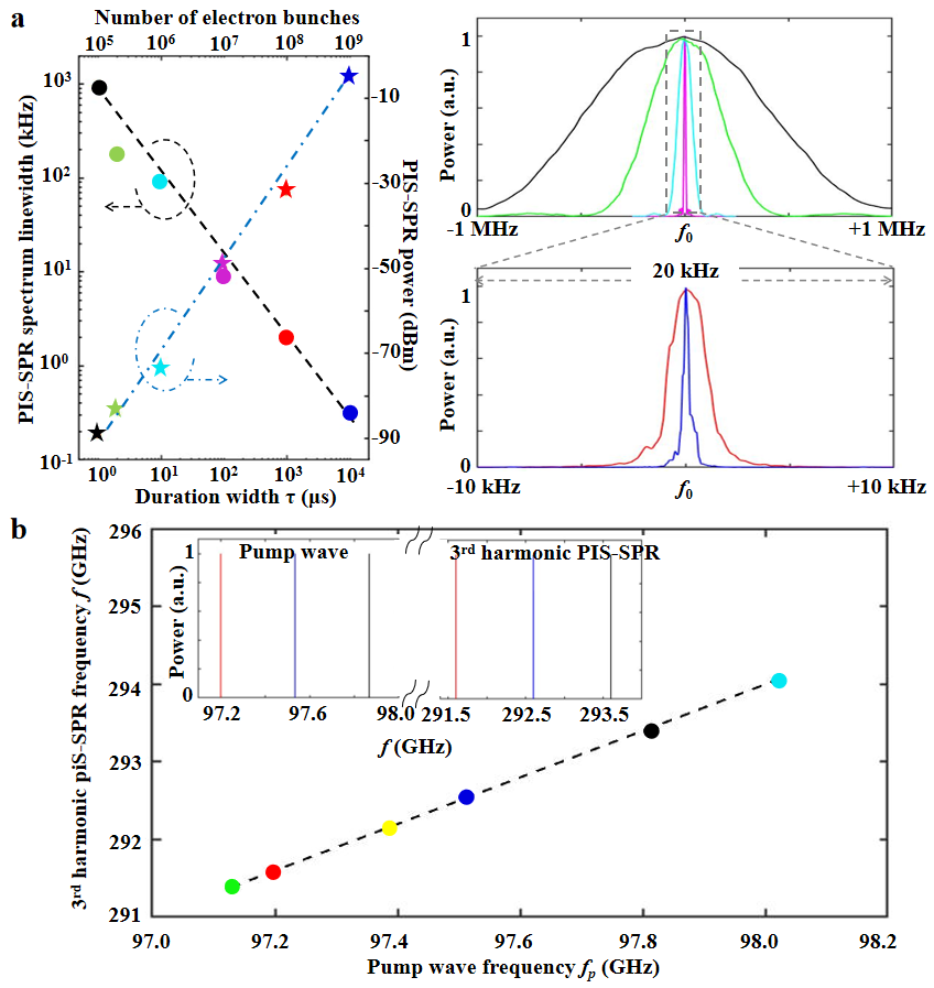 研究团队提出了泵浦诱导的受激S-SPR(PIS-SPR)新机制,并实现基于PIS-SPR的超窄频谱线宽小型化自由电子太赫兹辐射源。利用低功率、低频率泵浦波对直流电子束进行预群聚;预群聚电子与光栅和F-P腔共同作用产生PIS-SPR,泵浦波频率的电磁波功率被放大至百瓦以上,同时压缩电子形成高度群聚的周期电子团;最后利用小周期光栅提取电子团周围的高阶倍频分量,产生高频率、窄线宽相干太赫兹辐射。PIS-SPR效应克服了电子团数量有限、电子能量波动和库伦排斥恶化电子团等因素的影响,因而可以获得超窄频谱线宽的自由电子辐射。