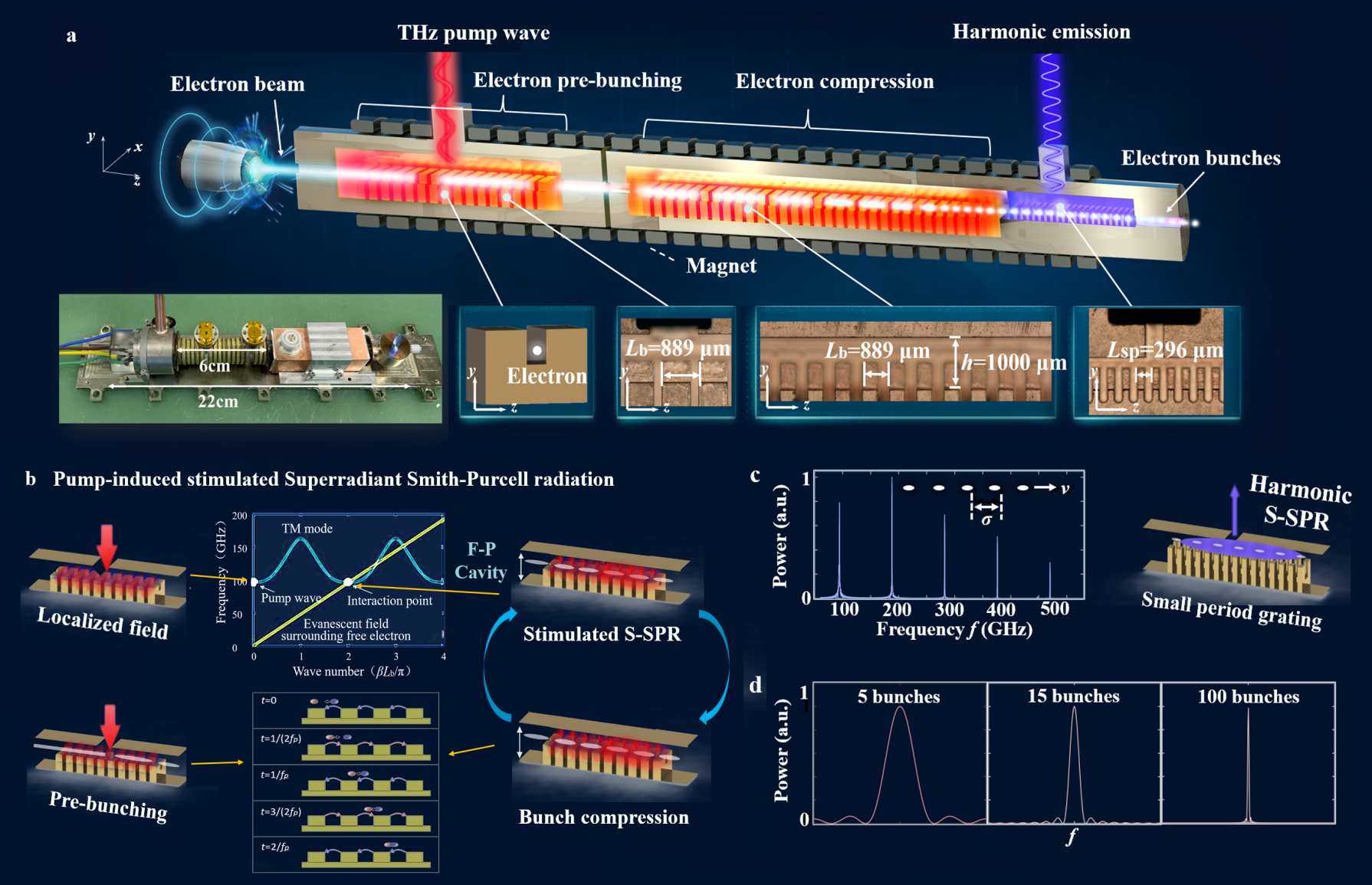 清华新闻网4月23日电 4月17日,清华大学电子系黄翊东教授团队刘仿课题组与中国电子科技集团第十二研究所合作,提出并实现了泵浦诱导的受激史密斯-帕塞尔超辐射(Pump-induced Superradiant Smith-Purcellradiation, PIS-SPR),成功将自由电子辐射线宽压窄至0.3千赫兹,并实现了一种小型化自由电子太赫兹辐射源。该工作为实现自由电子辐射线宽的大幅压缩及小型化器件中史密斯-帕塞尔的高次谐波产生提供了新途径,并为研究自由电子束团与微纳结构的相互作用搭建了重要平台。