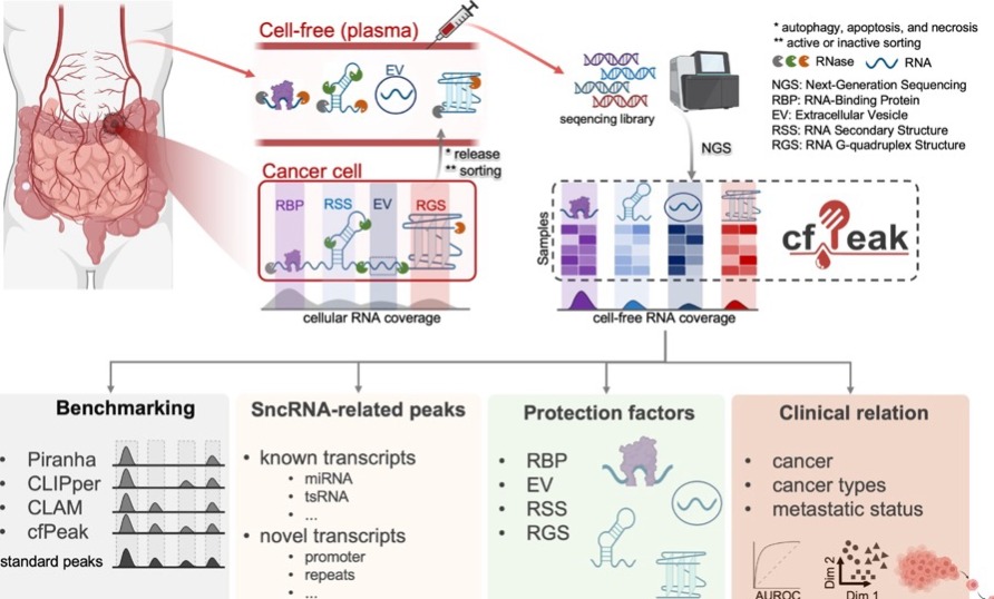 5月8日,清华大学生命学院鲁志团队、北京协和医院李梦涛团队、北京口腔医院秦力铮团队的毛明惠在《基因组生物学》(Genome Biology)杂志上发表题为“细胞游离RNA峰值分析揭示具有临床潜力的高频保护的短片段区域”(Peak analysis of cell-free RNA finds recurrently protected narrow regions with clinical potential)的论文,开发了针对cfRNA数据的片段化分析方法cfPeak,填补了cfRNA片段化分析的空白,为cfRNA片段组学的发展铺平了道路。