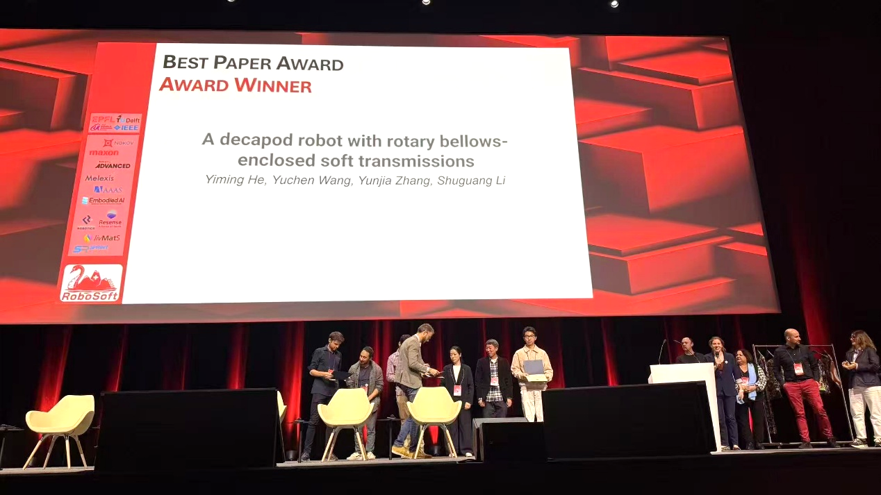 RoboSoft是国际软体机器人学领域最高学术会议,本届会议共有全球800余名学者参会,录用论文398篇,最终仅评选出1篇最佳论文,这也是中国学者首次在RoboSoft获得最佳论文奖。