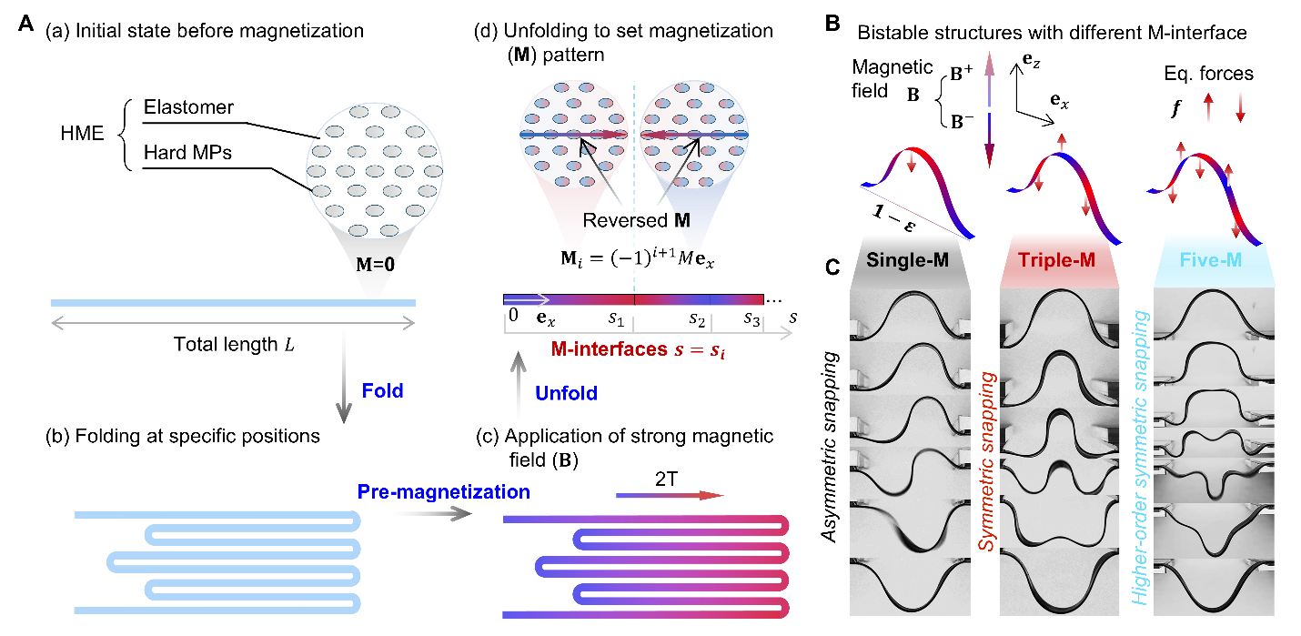 针对这一挑战,清华大学航天航空学院张迎超副研究员、力学与工程交叉研究院高华健院士和俞璟副教授联合其他研究者创新性地引入了“磁化界面”(M-interfaces)设计理念,在硬磁弹性体结构中预设交替磁化区域,使结构在外加磁场作用下形成一系列方向交错的等效力对(图1)。该构型在保持系统本征对称性的基础上,构建了内部“力场博弈机制”:驱动力诱导结构发生突跳失稳,等效阻力则有效抑制非对称模态的生成。借助这一“分布式调控”策略,研究团队首次在准静态条件下实现了对称性突跳失稳路径的稳定激发,并建立了适用于更复杂双稳系统的通用设计方法。