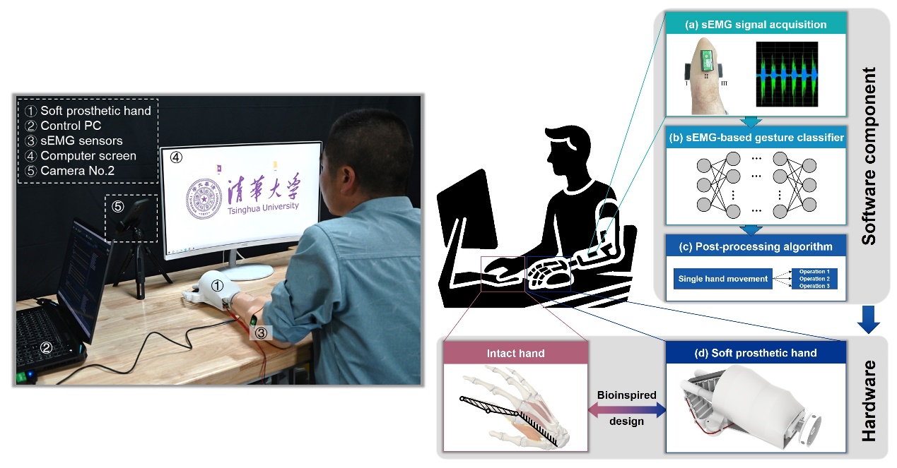 清华新闻网3月28日电 截肢者在与标准计算机外设(如鼠标、键盘)交互时存在操作困难的问题,显著影响其工作机会和生活质量。近日,清华大学机械系李曙光课题组与合作者共同研发了一种新型软体肌电假肢手,旨在改善截肢者与计算机的交互体验。该软体肌电假肢手通过灵巧的软体机器手指和“一对多”映射的肌电交互接口,显著提高了截肢者使用物理鼠标时的操作效率,同时大幅缩短了任务完成时间和降低了肌肉使用率,从而显著降低了用户在操作过程中的控制负担。研究为提升截肢者与计算机的交互能力提供了重要的理论和工程依据,展示了软体机器人假肢技术在未来的广阔应用前景。