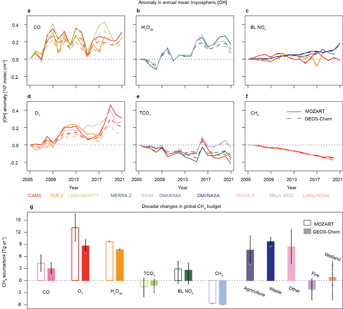 全球大气甲烷浓度自2007年以来急剧上升。除来自湿地、能源、农业和废弃物等自然和人为甲烷排放源外,甲烷在大气中的氧化去除过程也是调控其浓度的关键因素。羟基自由基OH是大气中最重要的氧化剂,约90%的甲烷化学汇(即甲烷被消耗过程)由OH贡献。然而,长期以来,科学界对于空气污染物如何在数十年时间尺度上影响全球OH以及甲烷收支的量化研究仍不完善。传统研究通常仅依赖单一的观测数据或大气模型模拟,难以全面捕捉空气污染物、OH浓度以及甲烷汇之间的复杂动态交互关系。