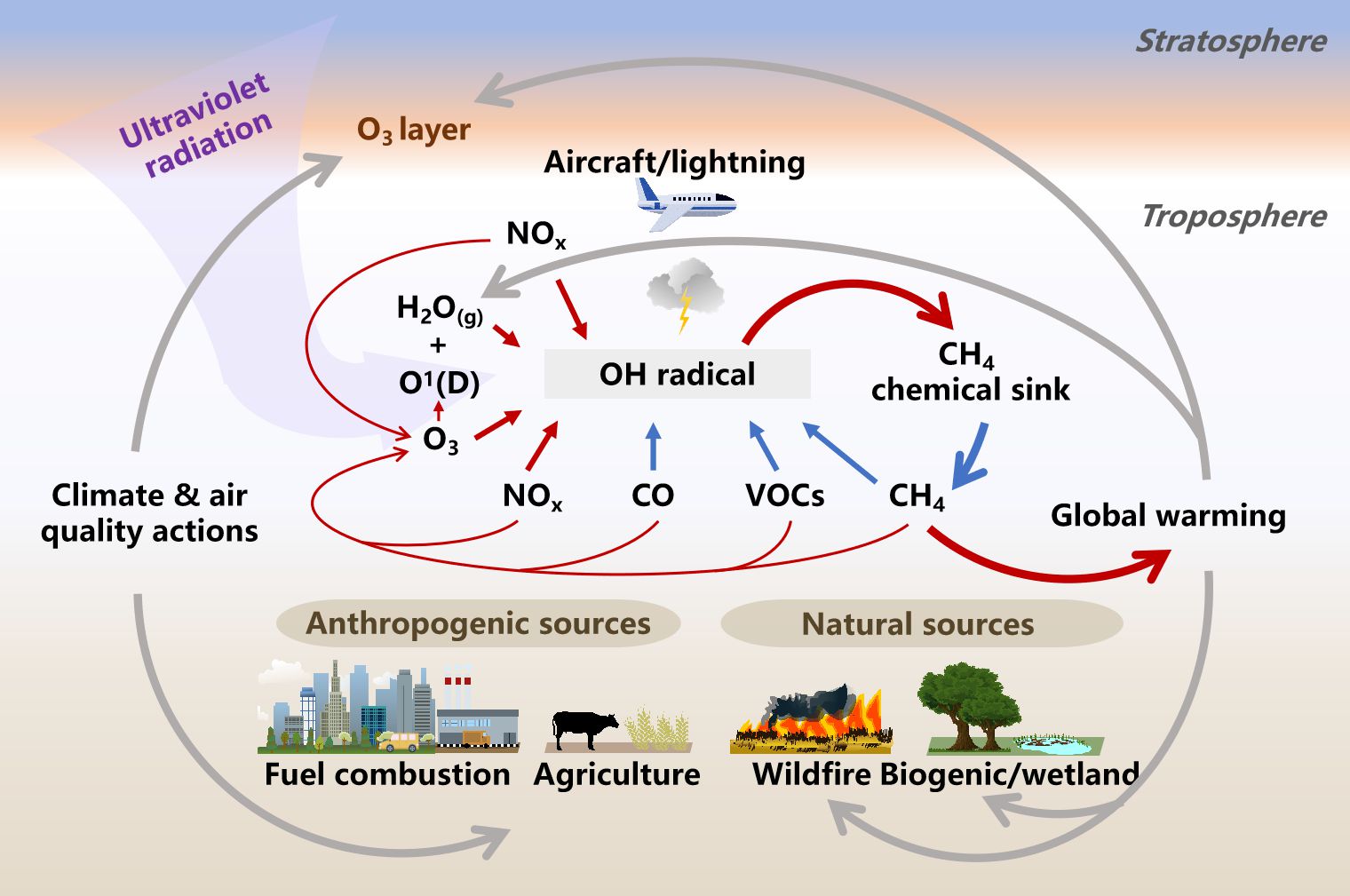 图2.全球空气污染与OH自由基、甲烷源汇收支之间的复杂相互作用