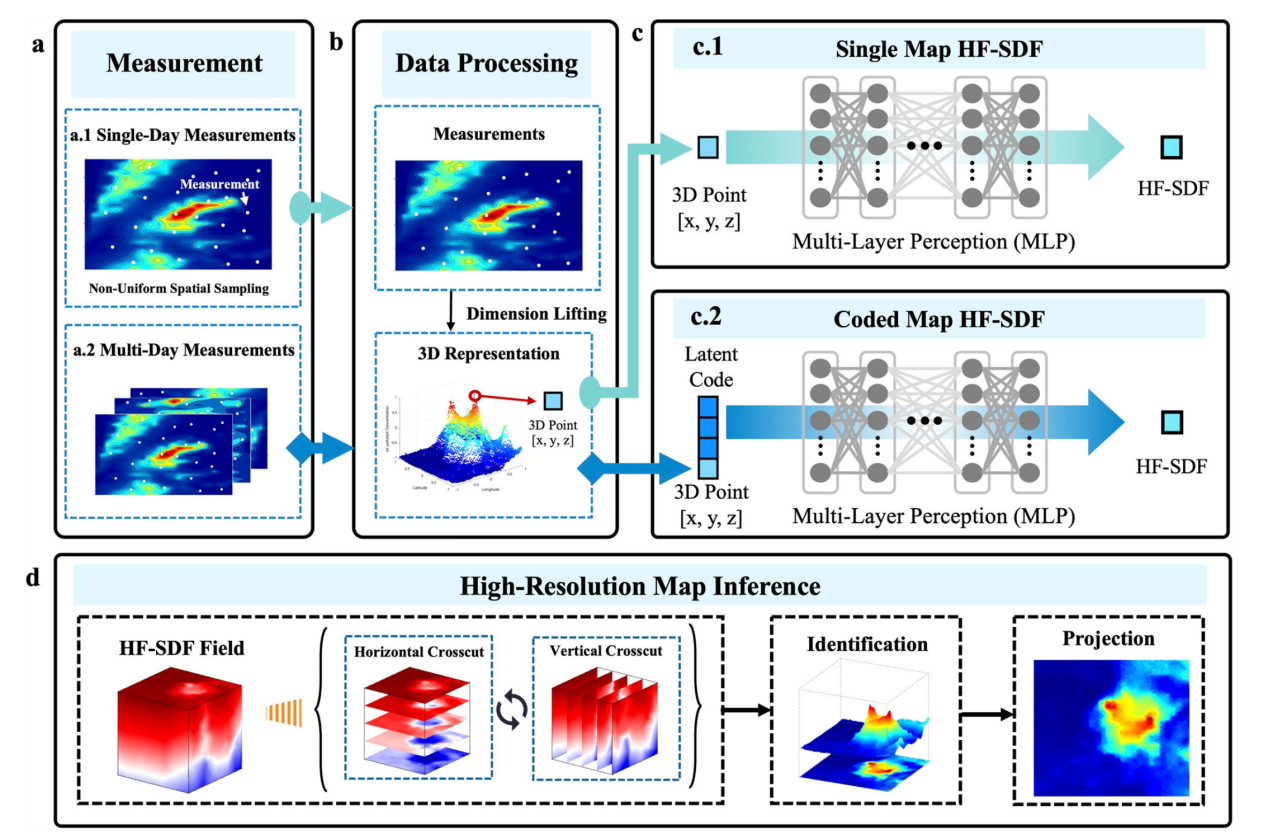 该研究首次将隐式表示模型引入空气污染浓度场的建模与重建任务中,通过几何约束和深度神经网络结合的方式,提出了名为“HF-SDF(Height-Field Signed Distance Function,高程场符号距离函数)”的新颖框架(图1)。不同于传统遥感插值或多变量回归类模型,HF-SDF不依赖于路网、土地利用等外部先验信息,而是将污染浓度场建模为一个连续可微的三维隐式函数,使得每一个二维空间位置都可以在任意分辨率下进行查询和建图。