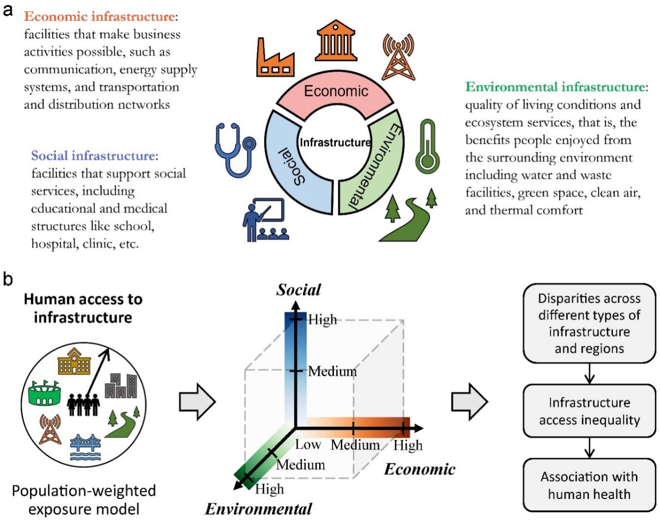 为填补这一空白,清华大学地球系统科学系(以下简称“地学系”)徐冰教授课题组联合国内外多家机构,构建了涵盖经济、社会与环境三类基础设施的全球格网数据库,结合人口加权暴露模型与混合效应回归方法,系统评估了全球166个国家的基础设施可及性差异及其对人类健康的影响(图1)。在本研究中,基础设施被定义为支撑经济与社会运转所需的物理系统和设施,基础设施可及性是指人群接触并使用周边基础设施的能力,而其不平等性则反映了这种能力在地理空间上的差异。