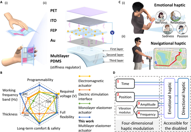 相关研究成果以“面向残障人群感知增强的情感性与方向性可编程柔性触觉接口”(Emotional and Directional Enabled Programmable Flexible Haptic Interface for Enhanced Cognition in Disabled Community)为题,于6月3日发表于中国科学技术协会(China Association for Science and Technology, CAST)与美国科学促进会(American Association for the Advancement of Science,AAAS)合作期刊《研究》(Research)上。
