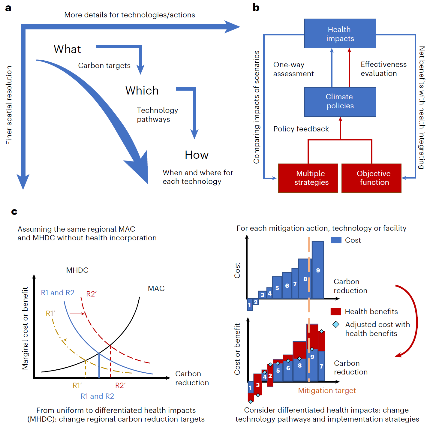 当前考虑健康的CBA研究面临四大决策转化的瓶颈:(1)健康影响(如发病率/死亡率)货币化方法与现实经济决策体系不兼容;(2)减排成本与健康协同效益存在时间和主体(即成本的承担者和效益的获得者)间的错配;(3)区域性研究不足;(4)缺乏直接指导气候政策制定和行动的研究。