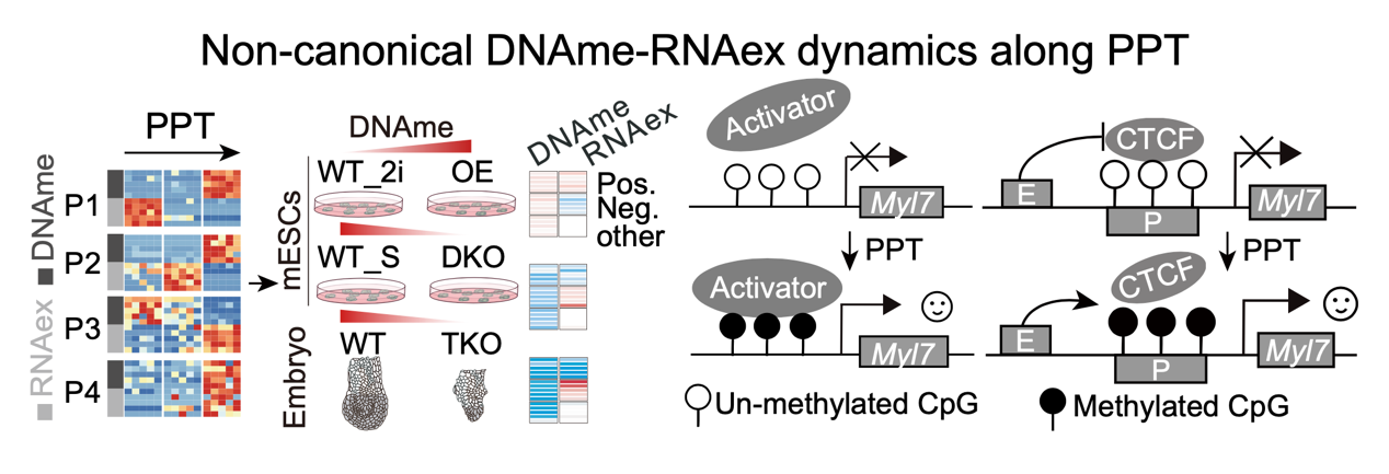 近年来,少量细胞或单细胞组学测序和分析技术的进展,极大推动了早期发育分子动态图景的绘制与理解,多个研究组曾报道哺乳动物胚胎在早期发育过程中DNA甲基化(DNA methylation,DNAme)的动态特征。然而该过程是否在物种间保守,以及哺乳动物胚胎PPT过程中DNAme和与基因表达(RNA expression,RNAex)如何协同调控、是否影响谱系命运转变,其机制有待进一步揭示。