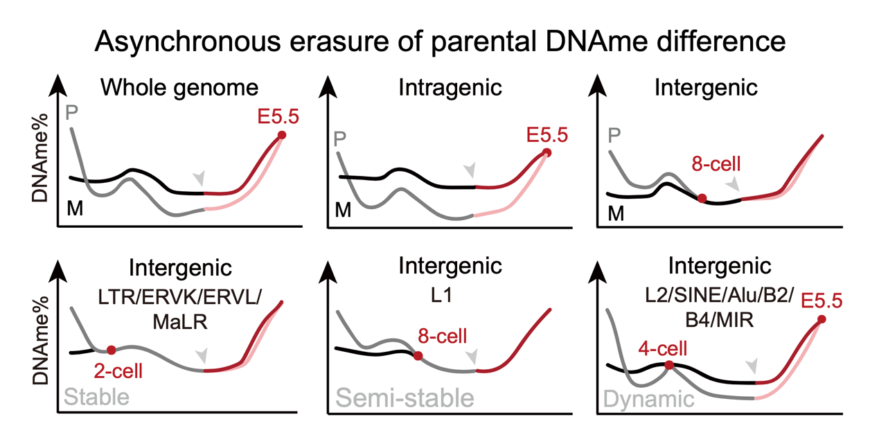 图2.早期胚胎发育中父母源DNAme差异的异步擦除