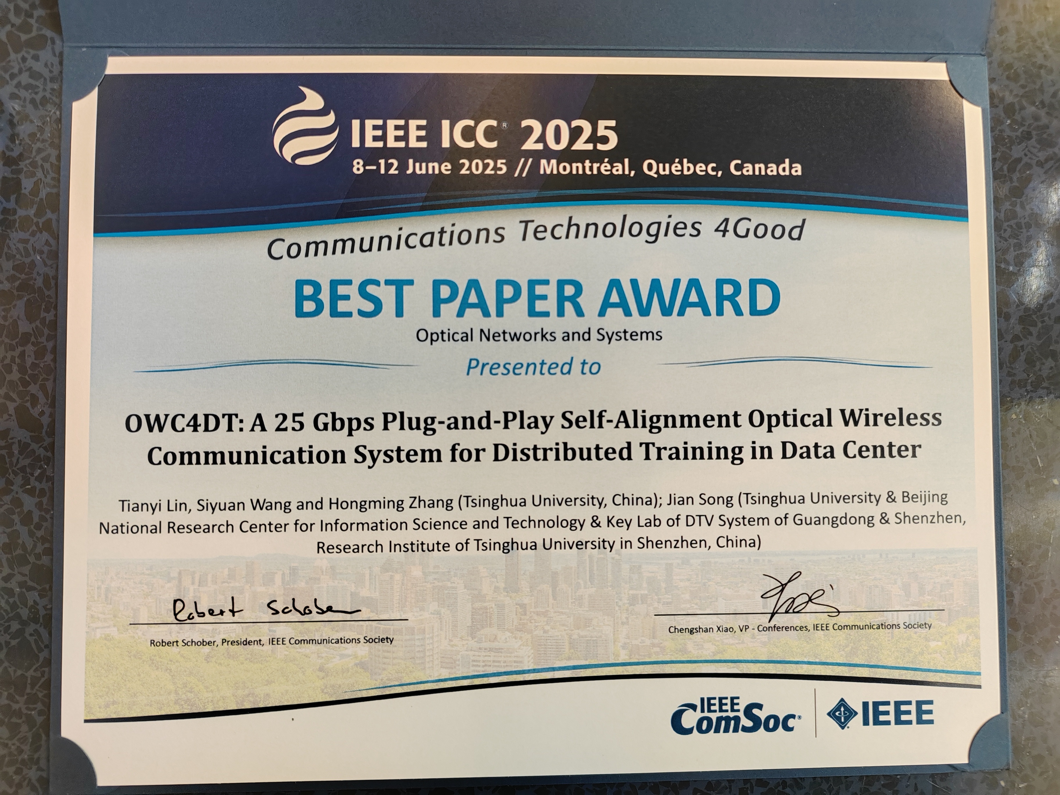 清华新闻网6月16日电 在近日举行的国际电气与电子工程师协会(IEEE)通信学会(Communication Society)旗舰会议2025 ICC(International Conference on Communications)上,由清华大学电子系2023级硕士生林天翊、2021级硕士生王思远,电子系教师张洪明和深圳清华大学研究院教师宋健合作完成的论文“面向数据中心分布式训练的25gbps即插即用自对准无线光通信系统”(A 25 Gbps Plug-and-Play Self-Alignment Optical Wireless Communication System for Distributed Training in Data Center)获得大会最佳论文奖。