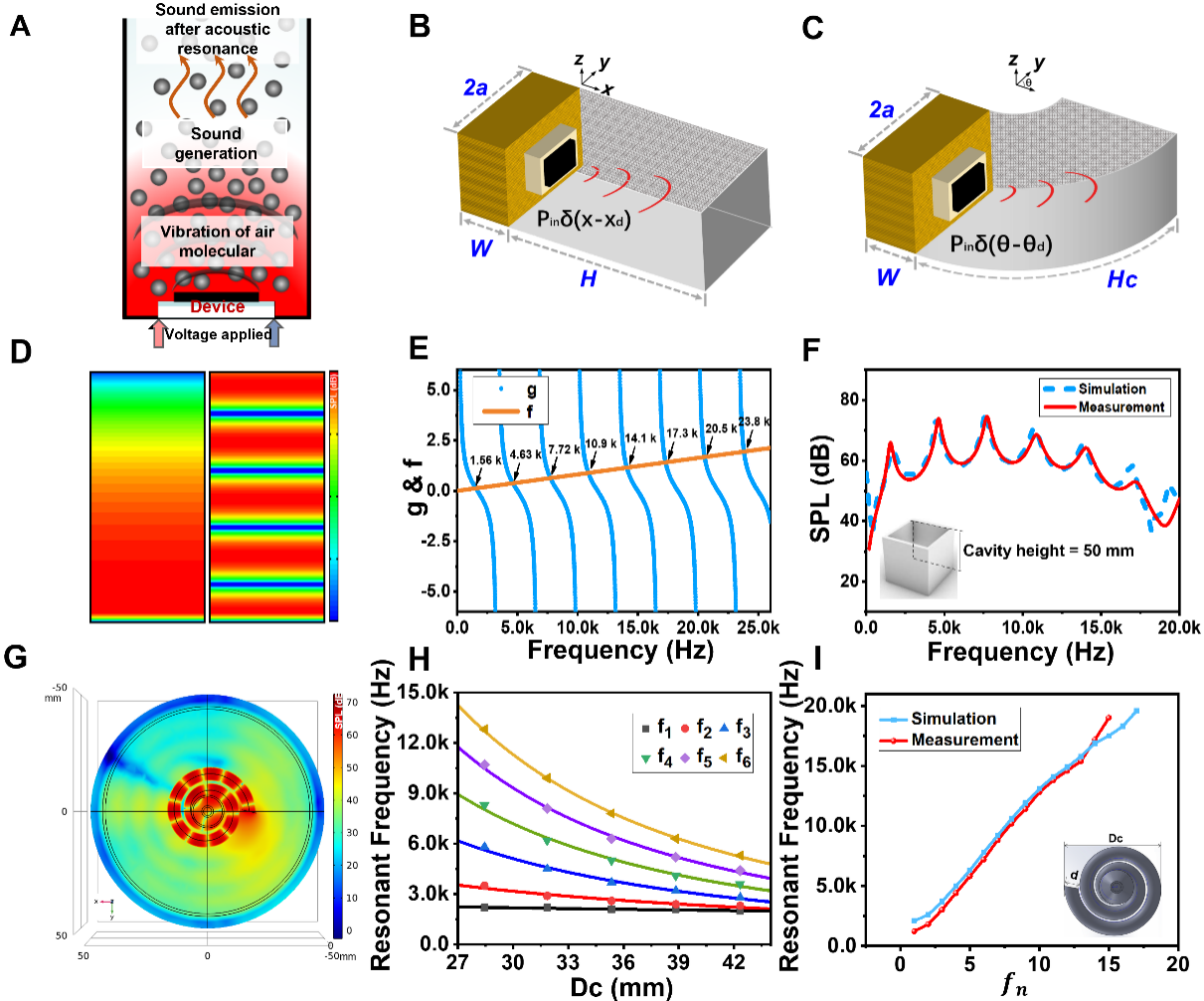研究团队创新性提出了热声共振的物理模型(图4):区别于传统扬声器的机械振膜发声原理,石墨烯器件通过焦耳热激发空气振动(图4A),实现100%空间利用率。实验测试表明螺旋腔体中的声传播路径等效于直腔高度(图4B、C),其谐振频率随腔体总尺寸增大而降低,当总尺寸从28毫米增至42毫米时,谐振峰f6从12.8千赫兹降至5.3千赫兹(图4H)。通过构建声场分布模型(图4D、G),实现了声压级仿真与实测数据的高度吻合(图4F、I),验证了该理论模型的适用性。
