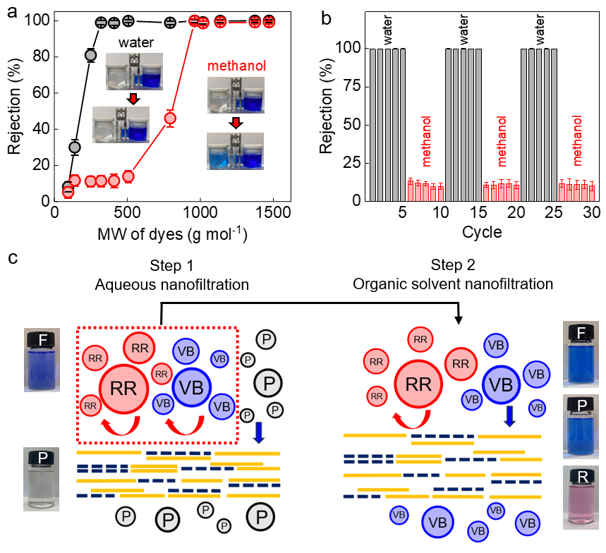 (a)氧化石墨烯/石墨烯复合膜在水和甲醇中对不同染料分子量的截留;(b)智能膜在水和甲醇溶剂中表现出可逆的染料截留性能;(c)使用单个氧化石墨烯/多孔石墨烯膜实现三种分子的分级分离