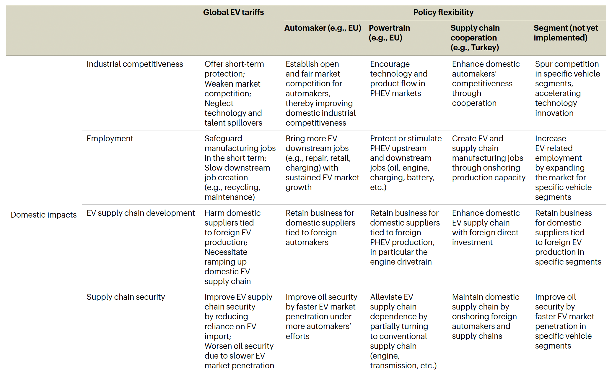 研究团队首先建立了涵盖四类关税灵活性机制(生产企业、动力系统、产业链合作、车辆级别)、八个国内/国际影响维度(本国产业竞争力、就业、产业链建设、供应链安全;全球低碳转型、产业合作、技术进步、贸易规则)的综合分析框架。基于该框架的分析表明,当前关税政策中已实施的三类灵活性机制整体上降低了关税的负面影响。第一,生产企业灵活性:欧盟基于调查,对不同车企采取了不同税率,尽管在部分关税数额上存在争议,但相比美国刚性、高税率且缺少依据的关税政策,欧盟关税政策仍保留了他国车企进入欧盟市场的可能,为贸易双方协商谈判提供了空间。第二,动力系统灵活性:欧盟仅针对纯电动汽车,而未对插电混动汽车征收关税,这一方面定向保护了本土纯电动汽车产业,另一方面保持了插电混动细分市场的充分竞争,有利于本土电动化转型,也为该领域的产业合作提供了机会。第三,产业链合作灵活性:当前,中国车企及供应链正积极寻求在海外建设产能,各国对这些车企提供关税豁免有助于吸引中国投资,加快本土产业链建设,创造就业机会,通过国际合作推动本土企业保持长期竞争力,加快电动化转型。