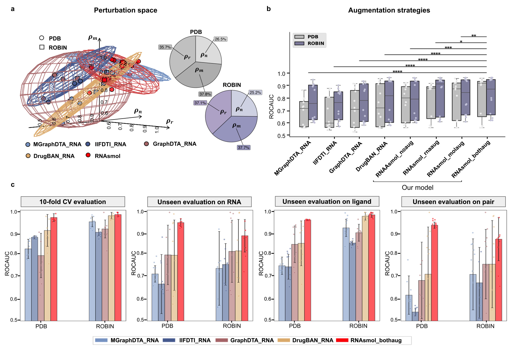 在数据扰动空间中,RNAsmol通过扰动策略有效地减少了真实负样本与未知互作空间之间的偏差。该策略通过对已知的负样本进行扰动,生成潜在的“负例”样本,同时通过数据增广技术扩展已知的正例和负例样本的边界。这使得模型能够更好地理解RNA与小分子之间的结合规律,尤其是在数据不均衡的情况下,避免了模型偏向已知的正负样本。实验结果表明,RNAsmol在10折交叉验证中的表现超过了传统方法,平均AUROC(曲线下面积)指标提升约8%,同时在未见样本的评估中,性能提升了约16%。这一优势证明了该方法在稀疏数据场景中的有效性,进一步推动了RNA-小分子结合预测的计算研究。