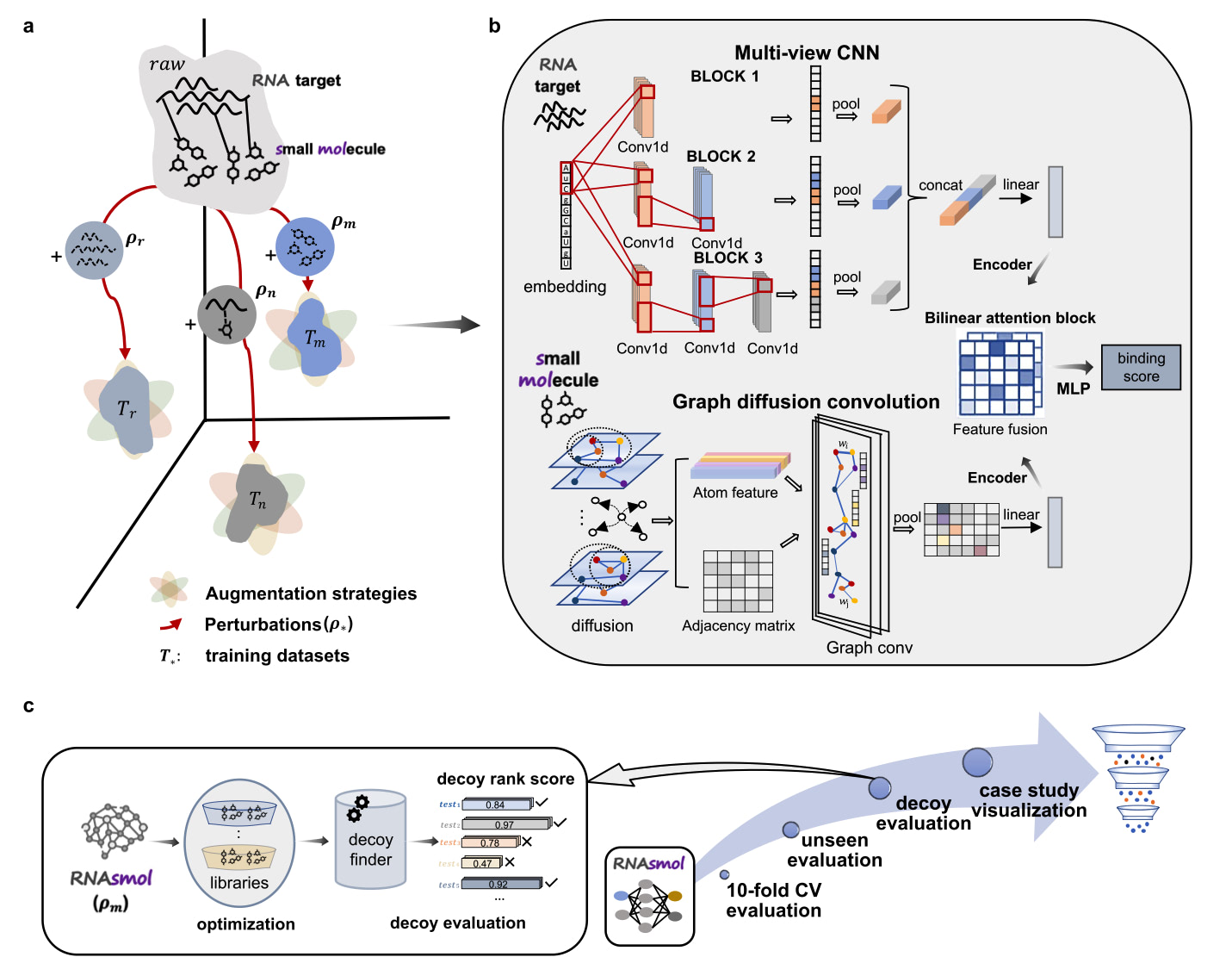 该工作提出的RNAsmol框架,是一种结合数据扰动和数据增广策略的深度学习方法。在该框架中,数据扰动通过对训练数据进行随机扰动模拟真实环境中的数据多样性,从而帮助模型更好地学习到RNA-小分子结合的规律。而数据增广则通过在已知互作的基础上生成虚拟的负样本和潜在的未标记样本,增加模型对未知空间的识别能力。这种策略不仅提高了模型的鲁棒性,还帮助其更好地捕捉到不同类型的相互作用模式。此外,该模型结合基于图的分子特征表示方法和图扩散卷积模块对药物小分子进行结构建模,通过基于注意力机制的特征融合模块在多个模态下对靶标和药物分子特征进行加权整合,最终实现RNA靶标与小分子之间的打分预测。
