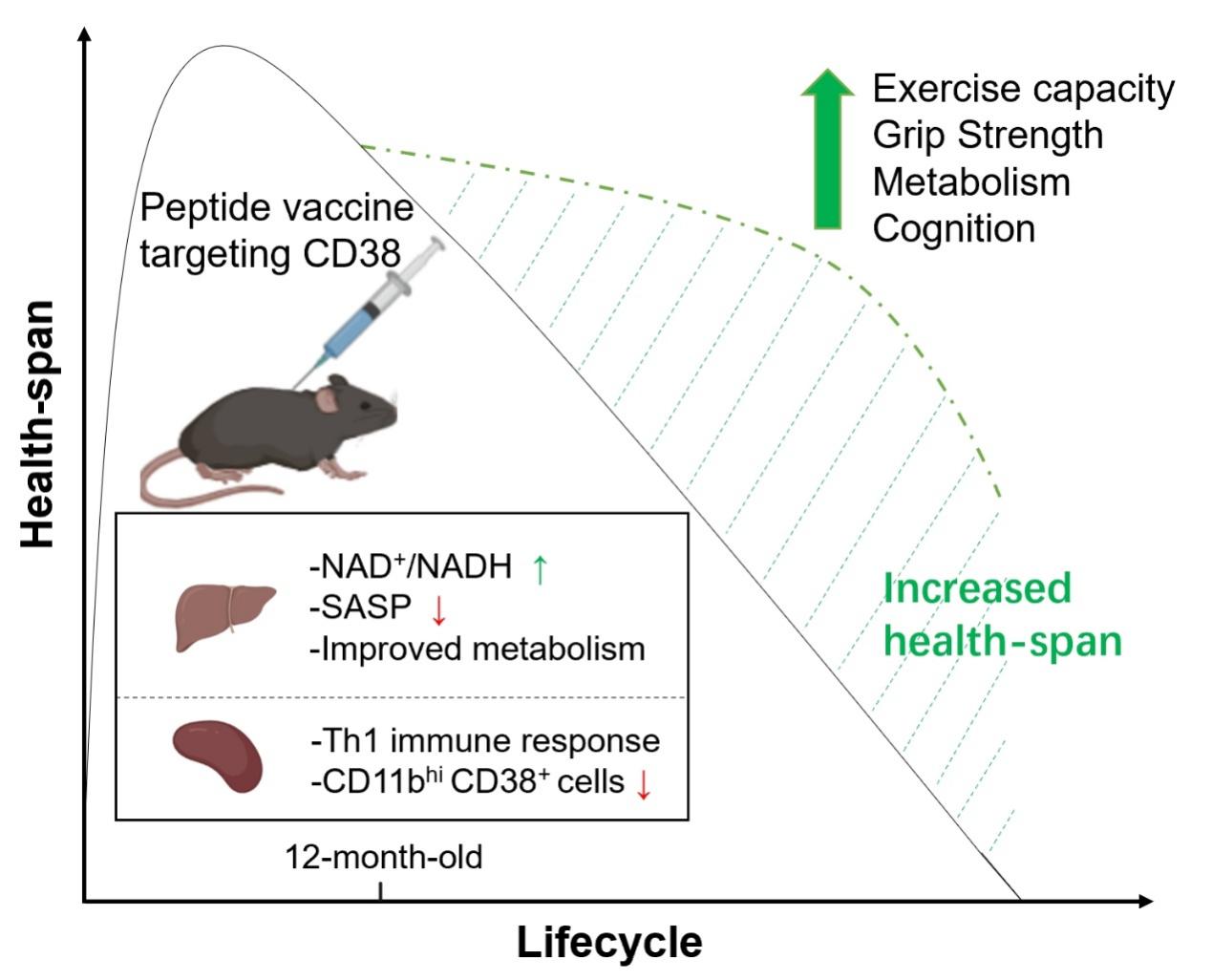 CD38是一种定位于膜表面的酶,其主要活性是水解烟酰胺腺嘌呤二核苷酸(NAD+)。CD38在衰老的器官或组织中高表达,导致了NAD+/NADH水平降低。研究人员通过免疫模型,在小鼠体内筛选了具有高免疫原性的CD38抗原肽,并揭示了CD38多肽疫苗在小鼠中诱导强烈的细胞免疫反应,有效靶向脾脏及肝脏中的CD38+髓系细胞,改善了与年龄相关的体能和认知功能下降。接种疫苗的小鼠显示出葡萄糖耐受性改善、氧气消耗增强和衰老细胞数量减少,同时多肽疫苗降低了肝脏组织中衰老相关基因的mRNA水平及衰老相关分泌表型,提高了NAD+/NADH水平。定量蛋白质组学显示CD38多肽疫苗能够系统地改善与自然衰老相关的异常蛋白质组变化,而小鼠体重及体温追踪、全血细胞计数和血清生化分析表明多肽疫苗具有较好的安全性。这些基于小鼠模型的研究结果提示CD38是抗衰老的重要靶标,为发展基于多肽疫苗的抗衰老方法提供了动物实验数据。