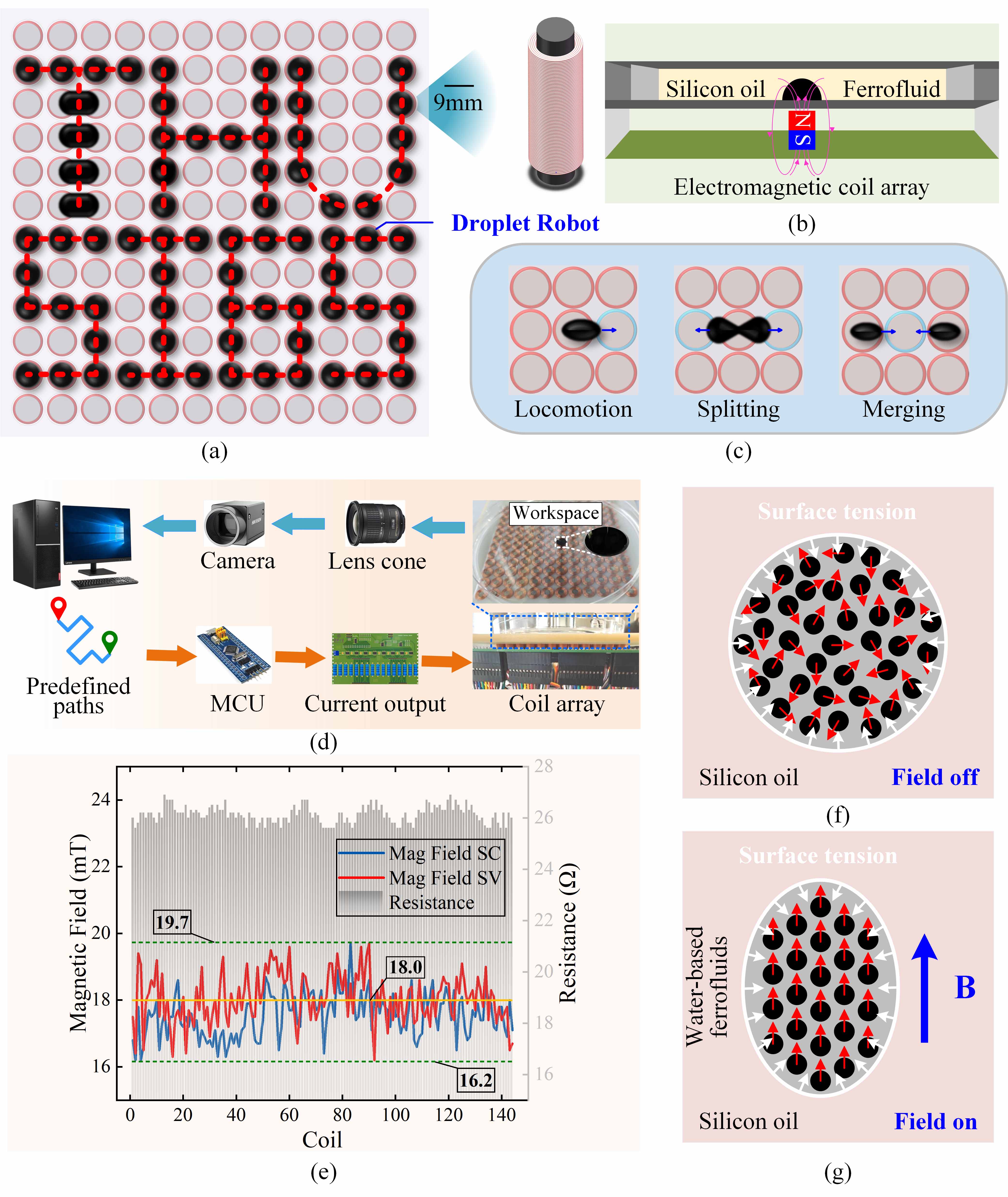相关研究成果以“用于大规模磁流体液滴机器人可编程控制的电磁线圈阵列系统”(Development of an Electromagnetic Coil ArraySystem for Large-Scale Ferrofluid Droplet Robots Programmable Control)为题,于6月30日发表于《IEEE机器人学汇刊》(IEEE Transactions on Robotics)。