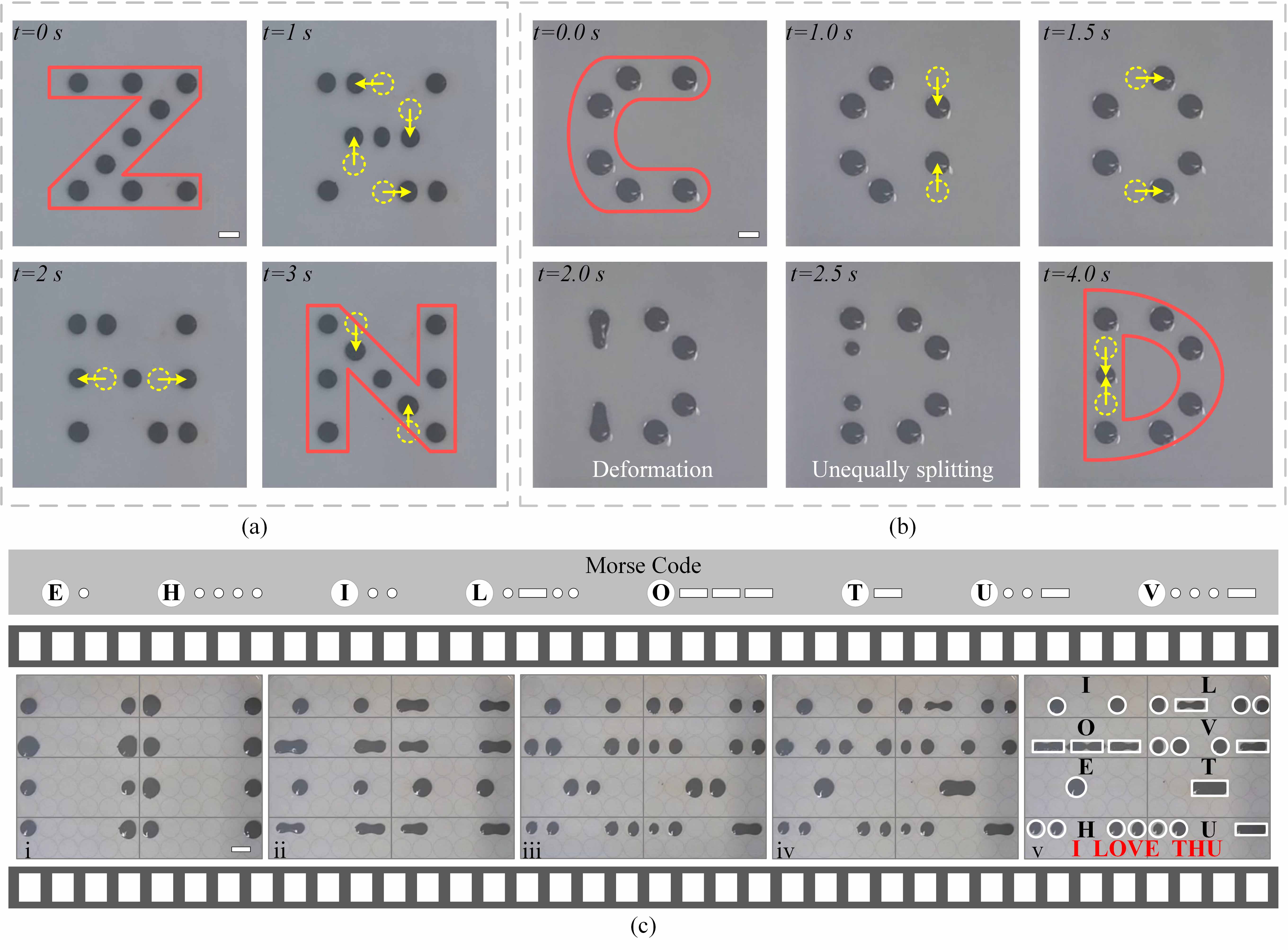 近期,清华大学深圳国际研究生院副教授曲钧天团队围绕磁流体液滴机器人在大规模、独立与可编程操控方面的关键技术难题,成功开发出一套基于电磁线圈阵列的可编程操控平台。通过灵活部署液滴机器人,该平台在数字图案显示、信息编码及流体操作等领域展现出广泛的应用潜力。