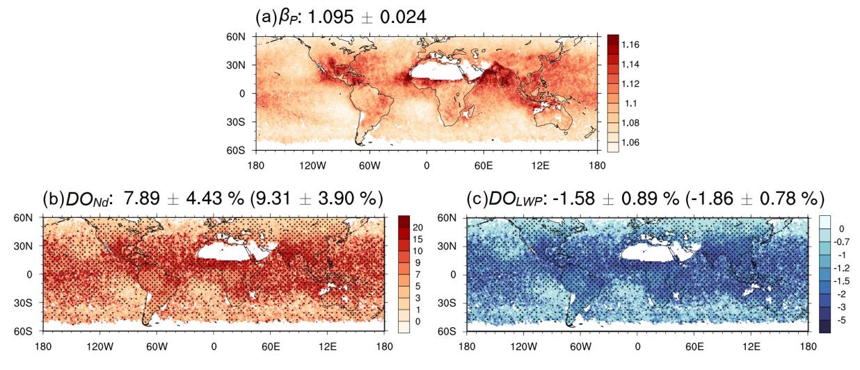 针对上述问题,清华大学地球系统科学系彭怡然副教授课题组联合中国科学院空天信息创新研究院胡斯勒图研究员团队,提出了基于云微物理过程机理和相关方程理论推导的新方法,结合多角度偏振卫星POLDER的观测,首次实现了液态层状云中离散效应影响气溶胶-云相互作用的全球定量评估。结果显示,离散效应分别抵消了由云滴数浓度变化和液水路径调整引起气溶胶-云相互作用的7%和-1.4%,部分削弱了气溶胶对全球变暖的冷却作用。