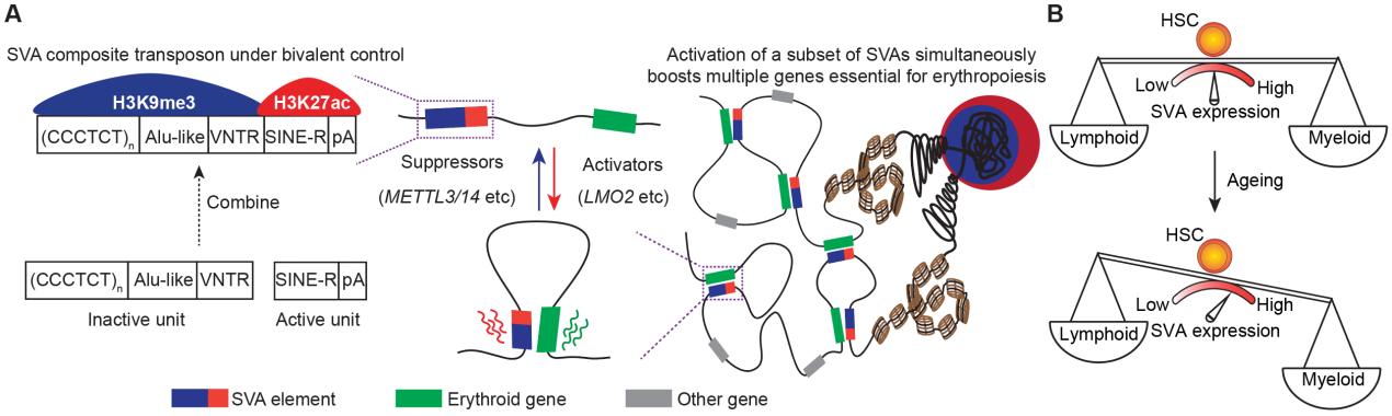 8月6日,清华大学生命科学学院、清华-北大生命科学联合中心刘念课题组联合北京大学生命科学学院、北大-清华生命科学联合中心李湘盈课题组在《细胞》(Cell)杂志上在线发表了题为“携带二价组蛋白修饰的复合型转座子作为RNA依赖性增强子调控细胞命运”(Composite transposons with bivalent histone marks function as enhancers in cell fate regulation)的研究论文。该研究首次揭示了H3K9me3和H3K27ac标记的二价染色质对复合型转座子SVA的协同调控机理和生物学功能,并证明了SVA的RNA依赖性增强子活性及其在造血系统分化和衰老相关髓系偏好性造血中的重要生理意义,提示其有望成为干预造血发育异常和造血衰老的潜在靶标。