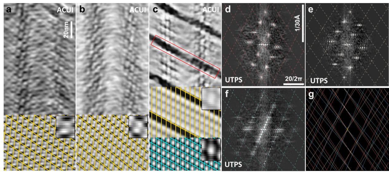 图3.MGF螺旋异质性分析。(a)-(c)MGF三种不同螺旋组装体的平均柱面展开图像,下方嵌入图为叠加晶格的对称平均图,右上角显示GMC氧化还原酶二聚体的放大图;(d)-(f)与(a)-(c)对应的管状展开功率谱,虚线表示倒易晶格;(g)倒易晶格差异比较。在同一图像中用相应颜色的直线网格展示了(d)-(f)中的倒易晶格