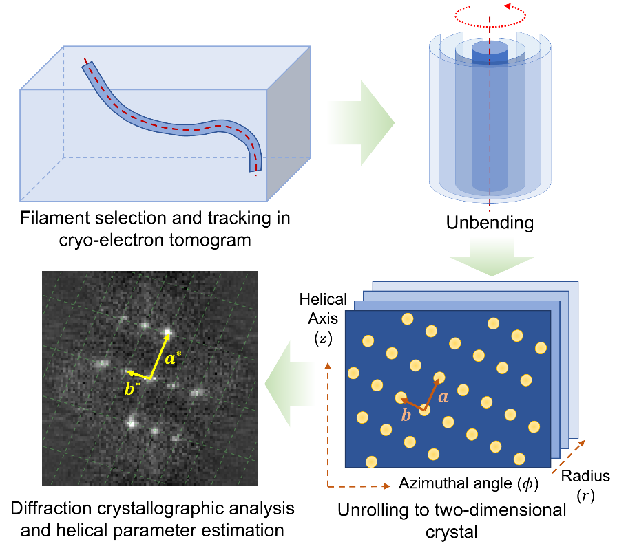 清华新闻网8月12日电 螺旋组装体(helical structure)广泛存在于细胞环境中,在细胞形态维持、物质运输、信息传递等多种生物过程中扮演着重要角色,其三维结构的解析对于揭示相关的生物过程机制具有重要意义。螺旋参数的测定是实现螺旋结构三维结构解析的关键基础。目前常用的测定方法是层线法,通过对螺旋组装体电镜图像的功率谱中的线段状衍射图样进行测量与标定,以实现螺旋参数的解算。在实际应用中,冷冻电镜(cryo-electron microscopy, Cryo-EM)图像的极低信噪比(signal-to-noise rate, SNR)、螺旋组装体的柔性形变以及功率谱中的贝塞尔重叠(Bessel overlap)现象等问题,容易导致层线的模糊与偏移,使得该类方法的应用具有极大挑战性。此外,传统的层线法主要针对单颗粒图像设计,不适用于冷冻电子断层图像,制约了在原位结构解析中的应用。