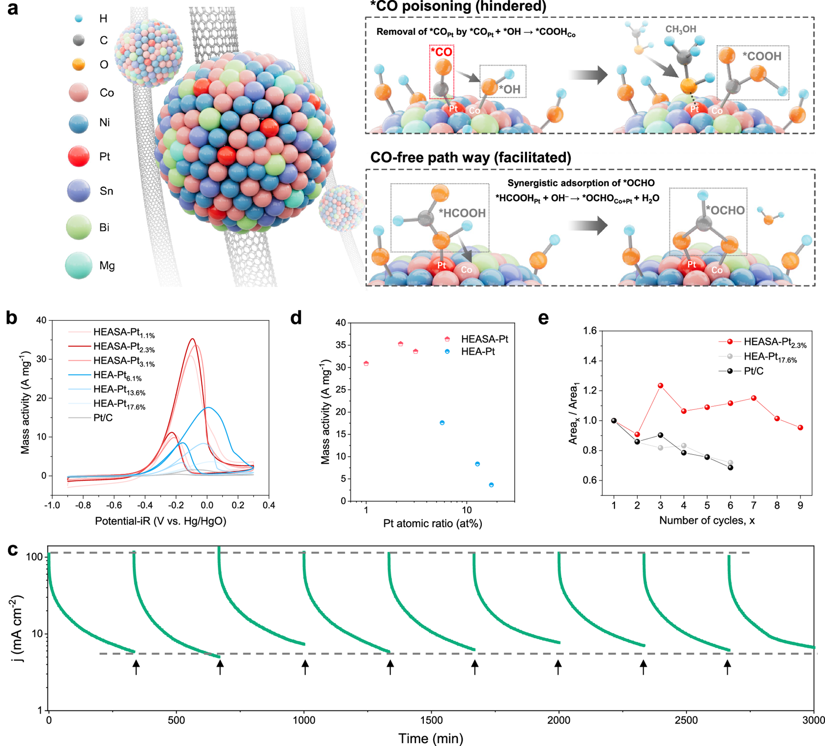 对此,研究团队利用高熵体系中元素随机分布的特点,通过极大降低Pt含量,设计并合成了一种新型的HEASA-Pt催化剂。HEASA-Pt中的Pt单原子位点不仅对MOR具有很高催化活性,而且保持了单原子Pt抗CO中毒的能力。该催化剂在Pt原子占比仅为2.3%的情况下表现出35.3 A mg⁻¹Pt的超高质量活性,在连续工作18万秒后仍保持较高的活性,并可恢复至初始值(图3)。
