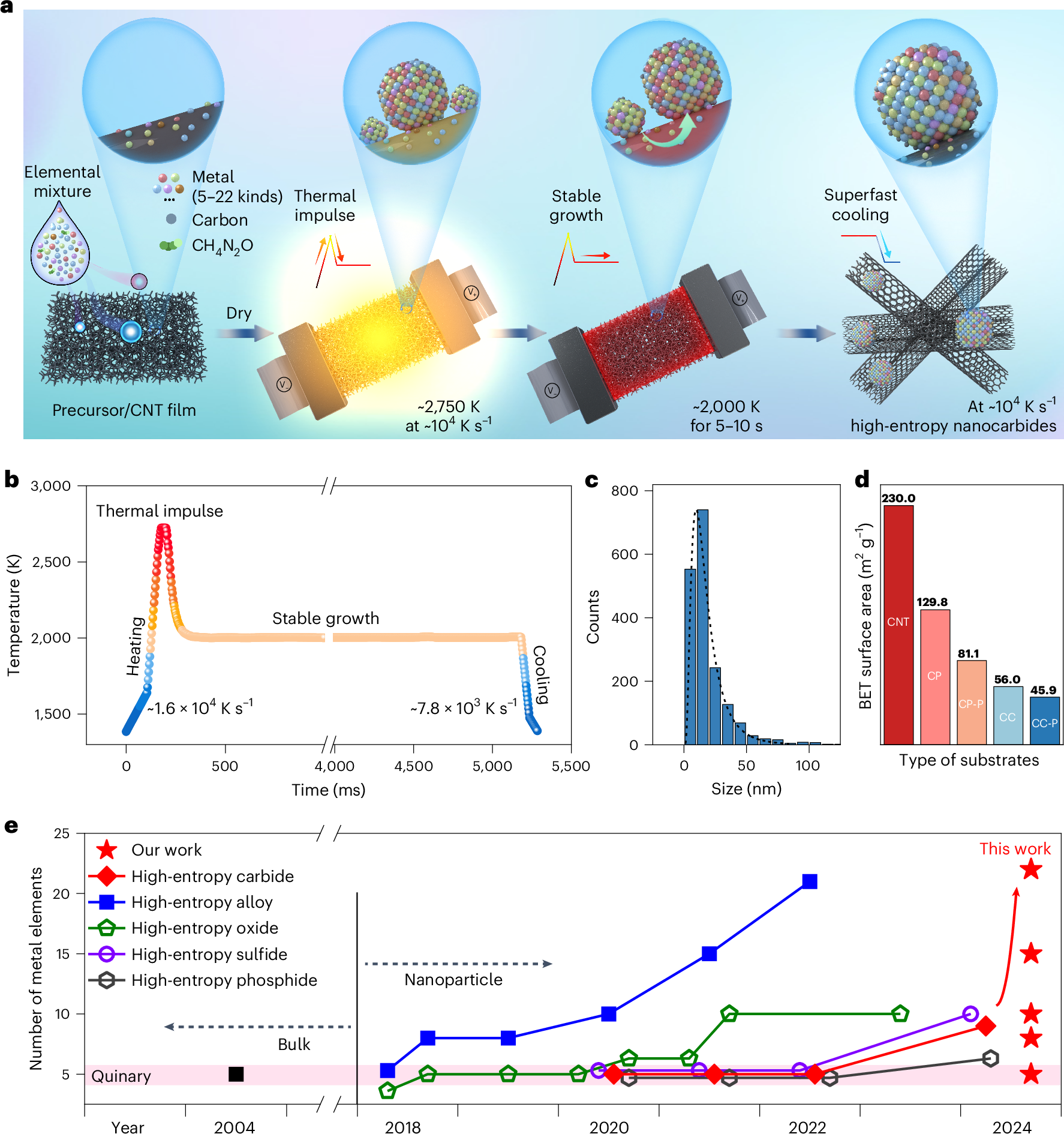 这其中,高熵纳米碳化物(HENCs)的合成条件尤为苛刻。其生长温度通常>2500K,这种极高温条件对控制纳米材料的生长提出了很大的挑战。目前对HENCs的合成仅局限于5至9种金属元素的体系,且其粒径、元素组成、数量难以精确控制。研究团队发现瞬态高温和碳纳米管的空间限域效应可以限制纳米材料的长大与团聚,并基于此发展了纳米限域热脉冲合成(NIS)技术,成功获得了金属元素数量任意可调(5≤n≤22)且粒径受限(~20nm)的HENCs。22-HENCs为目前报道中金属元素最多的高熵碳化物纳米材料,表明NIS在普适性和元素容量上均超越现有方法。