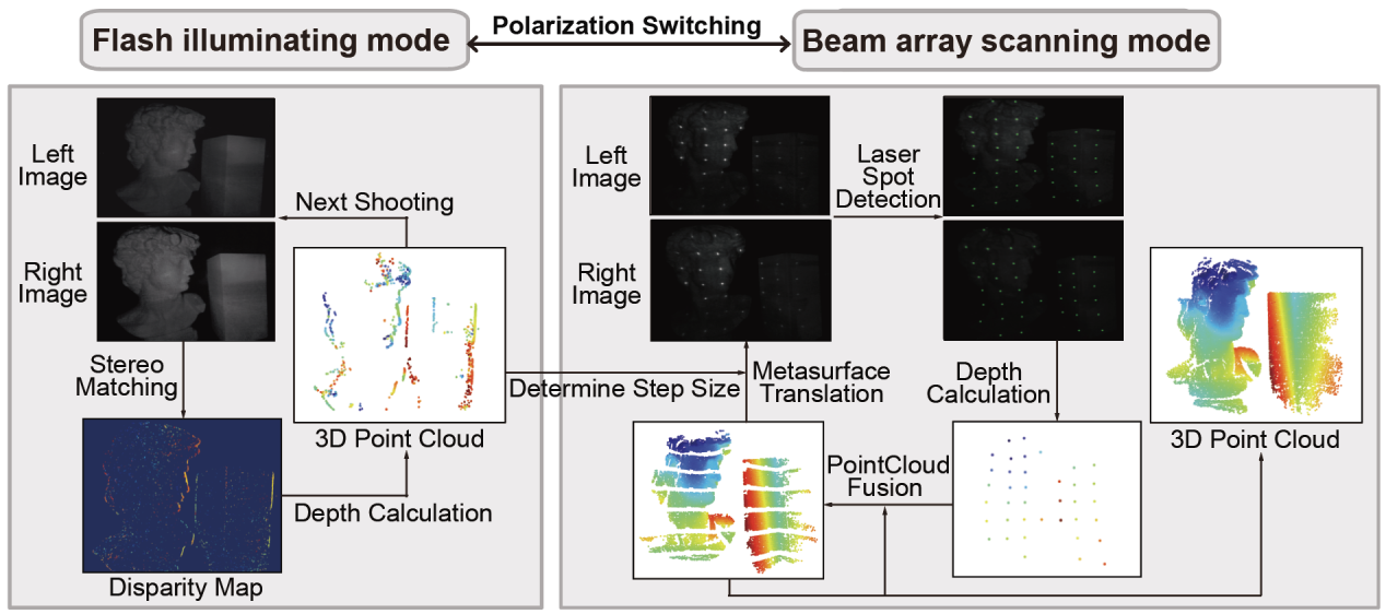 此外,研究团队基于光束调控器件构建了一套双模式激光雷达系统与自适应三维重建方案。系统首先工作在闪光模式下,快速完成整场景的快照式三维探测,获取目标边界形貌与复杂度信息。该初步数据为后续扫描模式中的步进策略提供依据,使系统能够根据实际目标特征智能选择扫描分辨率。在波束扫描阶段,系统可灵活执行粗略或精细的定向扫描任务,兼顾整体效率与局部细节。该系统通过偏振态驱动实现两种模式间的灵活切换,在保证全局快速探测的同时精确捕捉目标关键特征,突破了传统单一激光雷达在效率与精度之间互相矛盾的性能瓶颈。