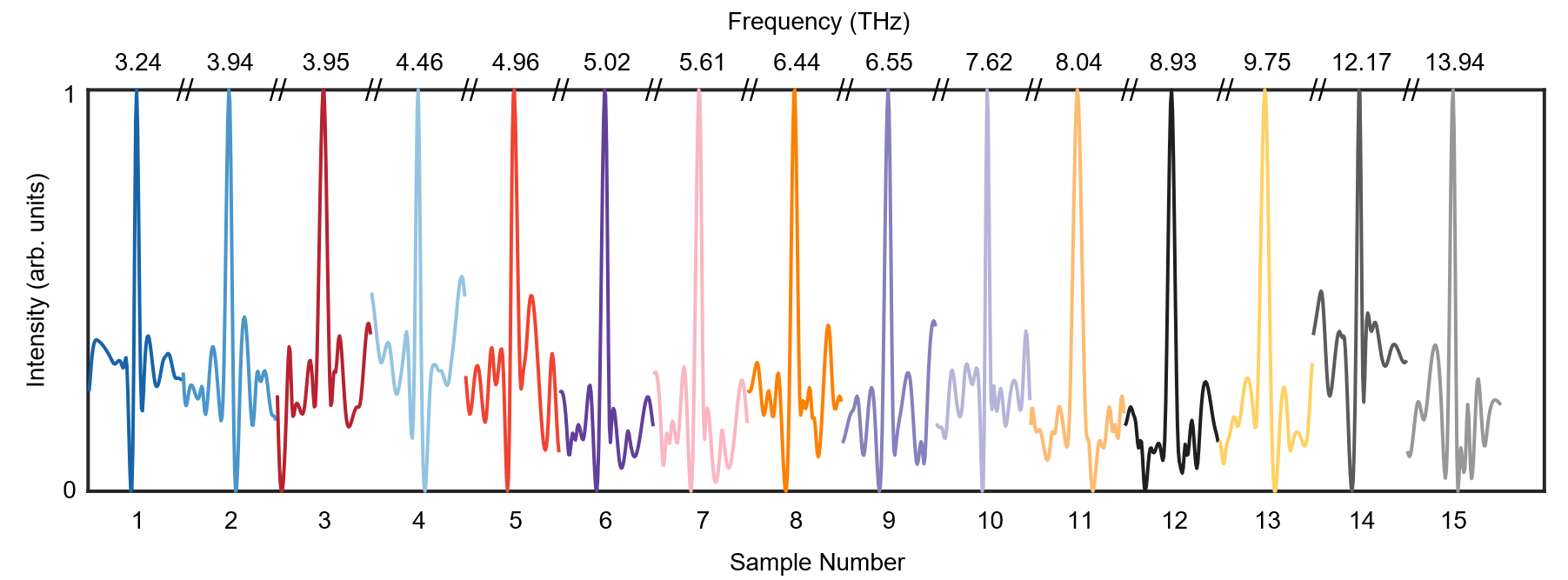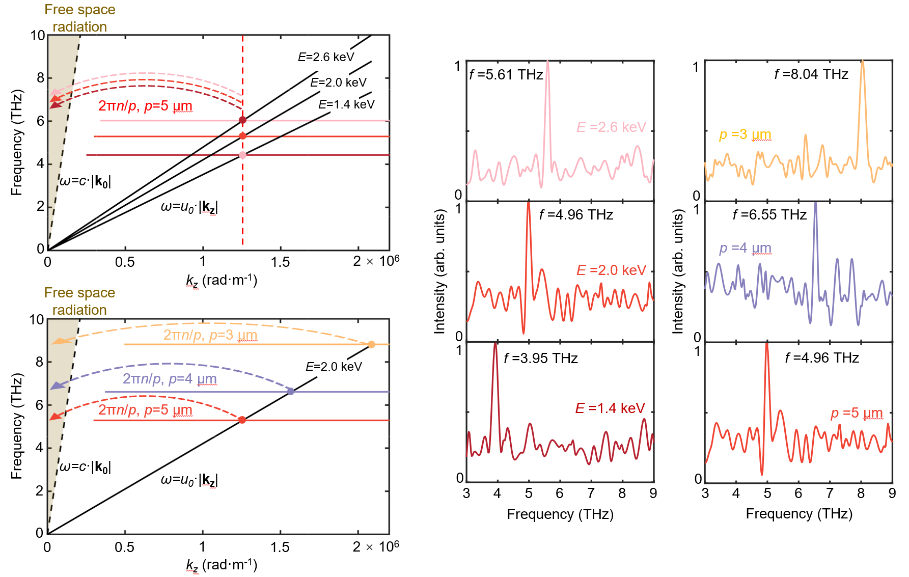 课题组进一步研究了太赫兹切伦科夫芯片的频率调谐特性。当自由电子束从双曲超材料上方飞过时,电子周围的消逝场耦合进材料内部成为可传播的太赫兹切伦科夫辐射,其波矢方向和大小与电子速度相关。当辐射传播至材料下表面,特定周期的金狭缝光栅结构可以提供波矢补偿,从而将材料内部的辐射提取至自由空间中,提取后的太赫兹辐射频率与电子速度和光栅周期相关。因此,通过调整芯片阴阳极施加电压的大小控制电子速度,并制备具有不同光栅周期的阵列化结构,即可实现太赫兹辐射的连续调谐。