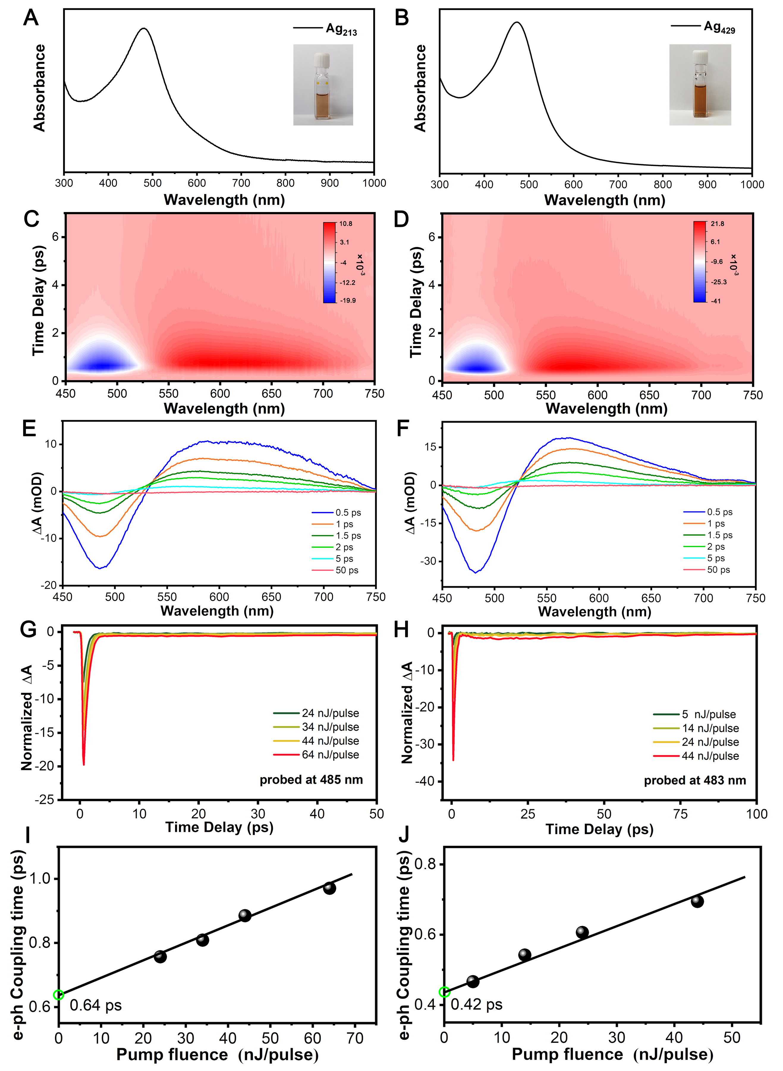 图2.Ag213与Ag429的稳态吸收光谱与激发态动力学特性