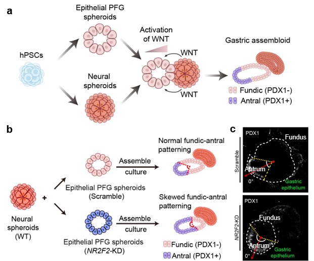 图2.类胃囊作为研究人类胃器官早期发育调控机制的全新体外平台 (a)微尺度组织定向组装技术流程示意图;(b)对类胃囊中不同谱系的组织模块独立开展基因编辑;(c)上皮源NR2F2是决定胃组织非对称图式发育的关键因子
