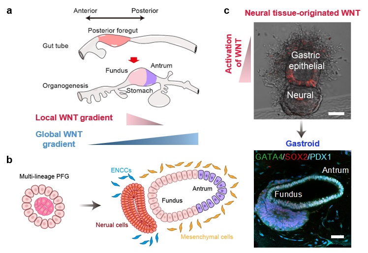 图1.神经源WNT信号梯度诱导胃前-后轴非对称组织图式发育(a)胃局部与胚胎全局的WNT信号梯度悖论示意图;(b)多谱系协同发育策略;(c)神经源WNT信号梯度(上)诱导非对称组织图式发育(类胃囊,下)