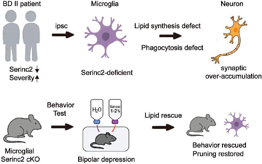 研究团队首次揭示了小胶质细胞中Serinc2基因缺陷与BDII的抑郁症状发生之间的分子机制。研究团队通过全基因组测序与病例-对照分析发现,Serinc2罕见突变与BD易感相关,并且在BDII患者血浆中其表达水平显著降低,与疾病严重程度呈负相关。