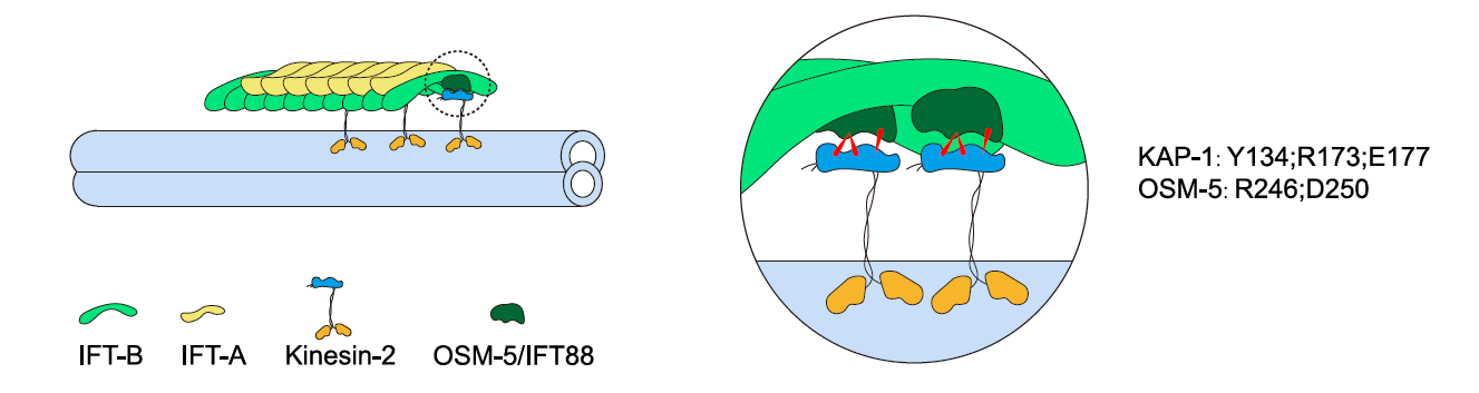 研究进一步通过系统突变筛选鉴定出核心功能残基:OSM-5的R246与D250(位于α7螺旋)分别与KAP-1的E177、Y134/R173形成盐桥和极性相互作用网络。线虫突变体回补实验表明,核心突变(如KAP-1-3M: Y134A/R173A/E177A)虽不影响蛋白质稳定性,但导致驱动蛋白-2无法进入纤毛;而IFT88-2M(R246A/D250A)突变体中驱动蛋白-2同样滞留于纤毛基部,证实该相互作用特异性调控kinesin-II的招募与激活。研究还发现,外围静电相互作用对复合体形成和IFT功能非必需,突显核心疏水与形状互补界面在耦联中的决定性作用。