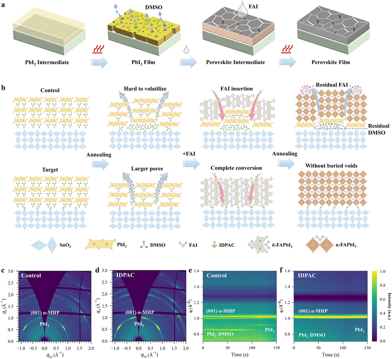 在顺序沉积法制备钙钛矿薄膜过程中,部分DMSO以配体形式嵌入PbI2晶格形成PbI2·DMSO络合物,而剩余DMSO挥发后造成多孔形貌。埋底界面的DMSO作为路易斯碱,被SnO2上的氧空位和PbI2中不饱和的Pb2+双重吸附,抑制了退火过程中的DMSO挥发,从而形成较致密的PbI2薄膜。浸渍FAI溶液后,FAI通过与PbI2·DMSO中的DMSO分子间交换生成δ-FAPbI3,但受限于孔径和表面张力,FAI渗透不完全,导致埋底界面残留PbI2,表面FAI富集,且吸附的DMSO难以去除。高温退火时,晶粒生长与晶界闭合进一步阻碍DMSO逸出,形成界面空洞。引入IDPAC修饰后,羧基与碘代基官能团分别钝化氧空位与配位不足Pb2+,削弱DMSO吸附并促进其充分挥发,形成疏松结构以利于FAI渗透和钙钛矿完全转化。原位掠入射广角X射线散射(GIWAXS)证明了退火过程DMSO的快速充分去除和钙钛矿结晶取向优化。