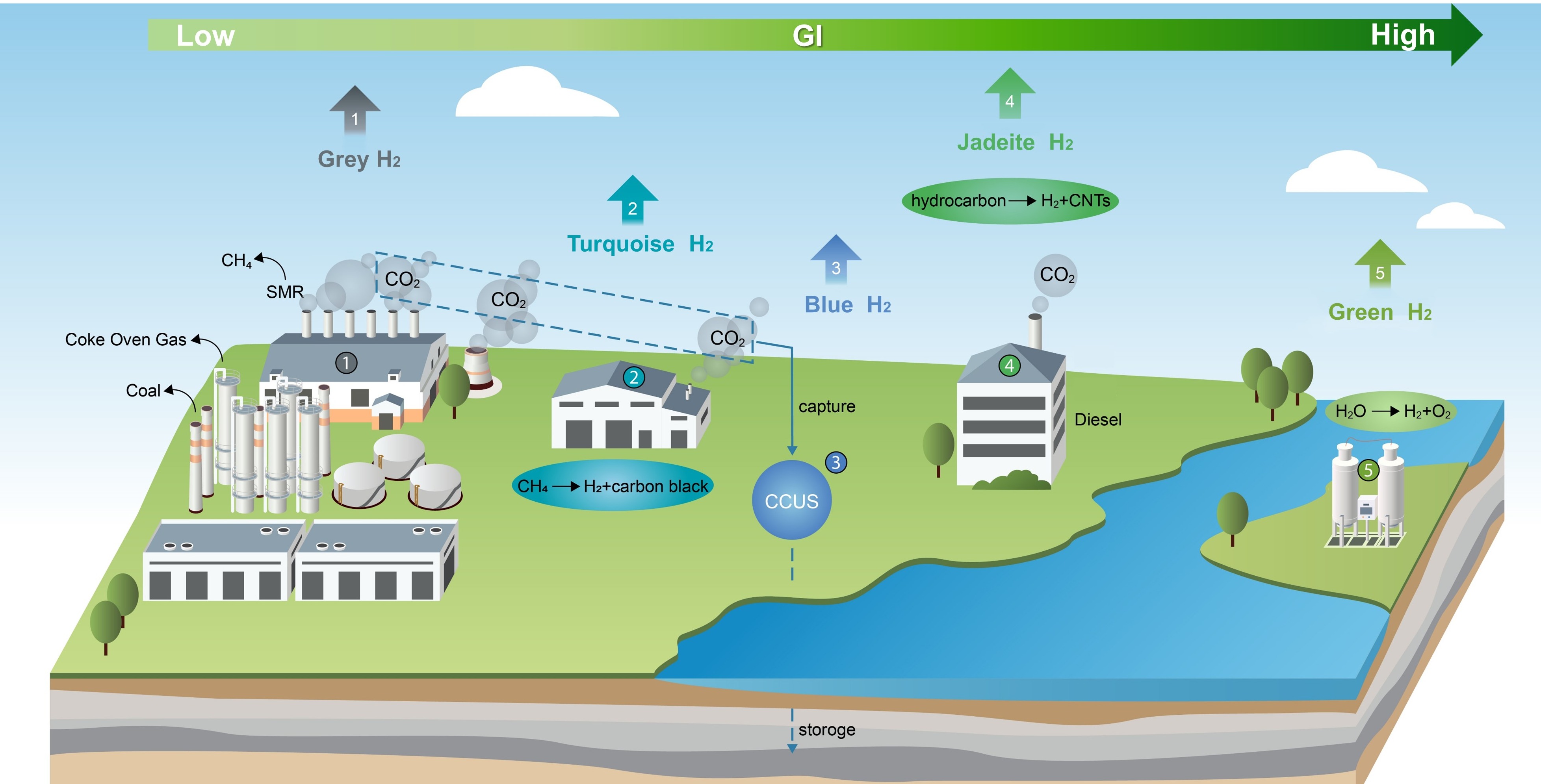 近日,清华大学化工系骞伟中、崔超婕团队提出了一种新的“翡翠绿氢”的新概念,其实质是通过不同的烃类进行复配,在无氧、高温条件下催化裂解时,达到一种接近既不吸热、也不放热的转化生成氢气与碳材料的状态。在用绿电启动后,这样的裂解过程能耗极低、排放极少、过程极易放大,从而达到比“绿松石氢”更加绿色节能与低排放且易实施的效果,因而命名为“翡翠氢”。