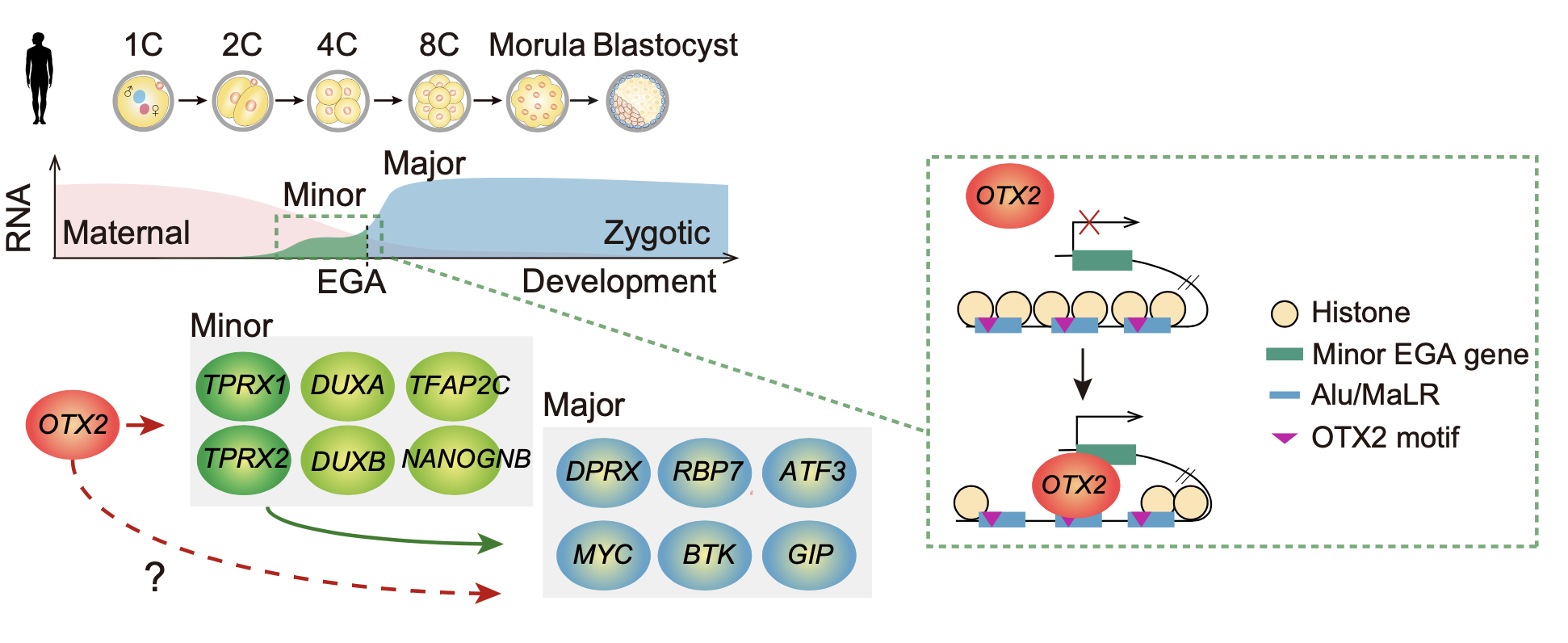 清华新闻网10月30日电 胚胎基因组激活(Embryonic genome activation, EGA),或称合子基因组激活(Zygotic genome activation, ZGA),标志着受精后的首次转录事件。在此过程中,母源转录本逐渐被合子转录本所取代,是生命延续过程中的一个重大转变。在EGA过程中,染色质的开放性以及表观遗传修饰等会经历一系列剧烈的重编程。EGA对于细胞命运决定过程中的基因时空特异性表达以及原肠胚的形成等胚胎发育阶段十分关键。从成熟的卵母细胞到受精后的EGA前,胚胎中的转录始终保持在沉默状态,EGA的转录如何启动是领域内长久以来关注的问题。
