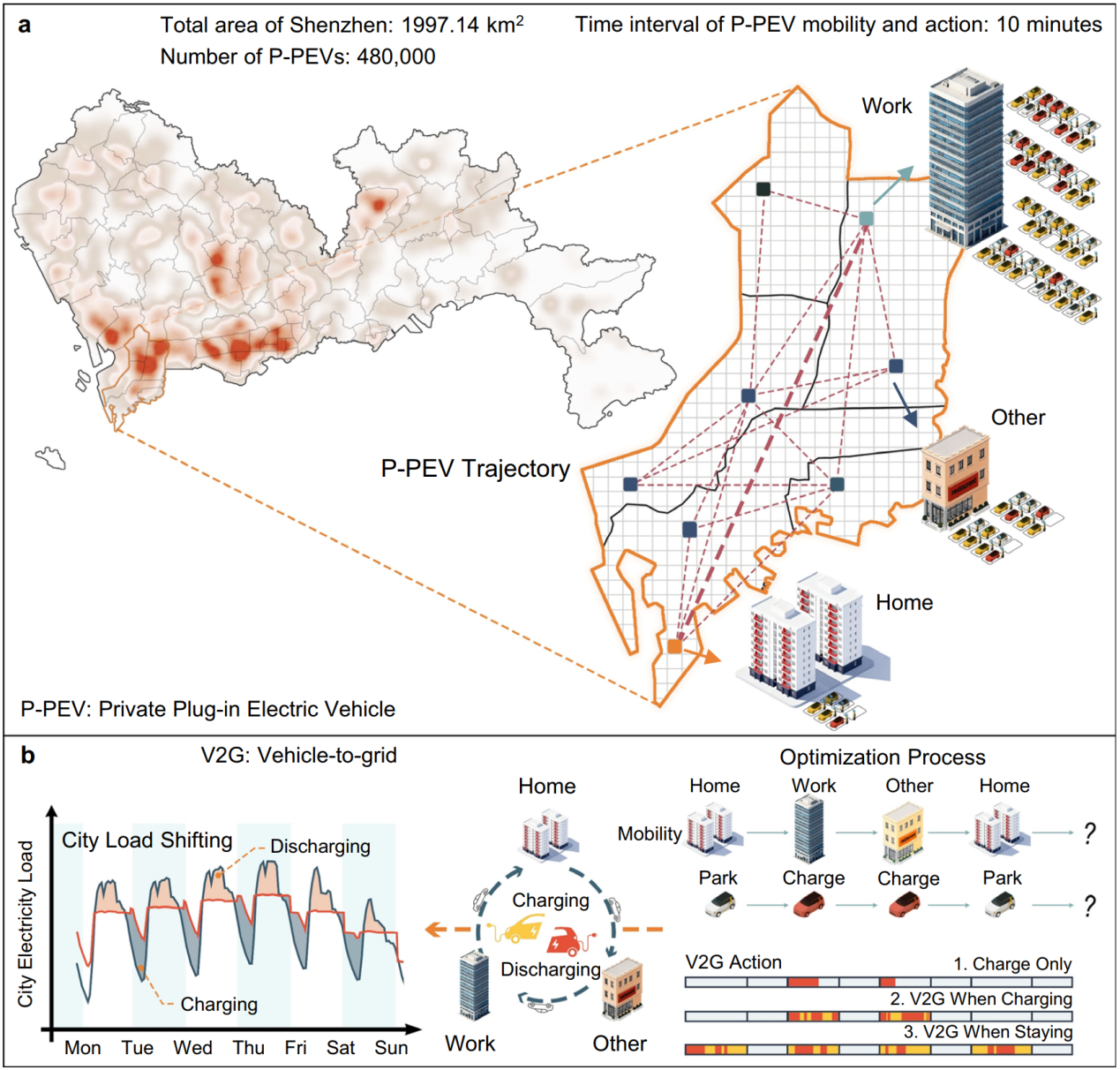 为此,清华大学深圳国际研究生院张一副教授团队建立了移动-V2G耦合分析框架,模拟了广东省深圳市48万辆私家电动汽车的出行和充放电行为,并详细分析了它们参与电网调节的效果。研究不仅为超大城市量化评估V2G潜力提供了开创性的分析工具,其结论也为政府制定高效、公平且用户友好的车网互动政策提供了关键的科学依据,避免了未来可能的盲目投资。