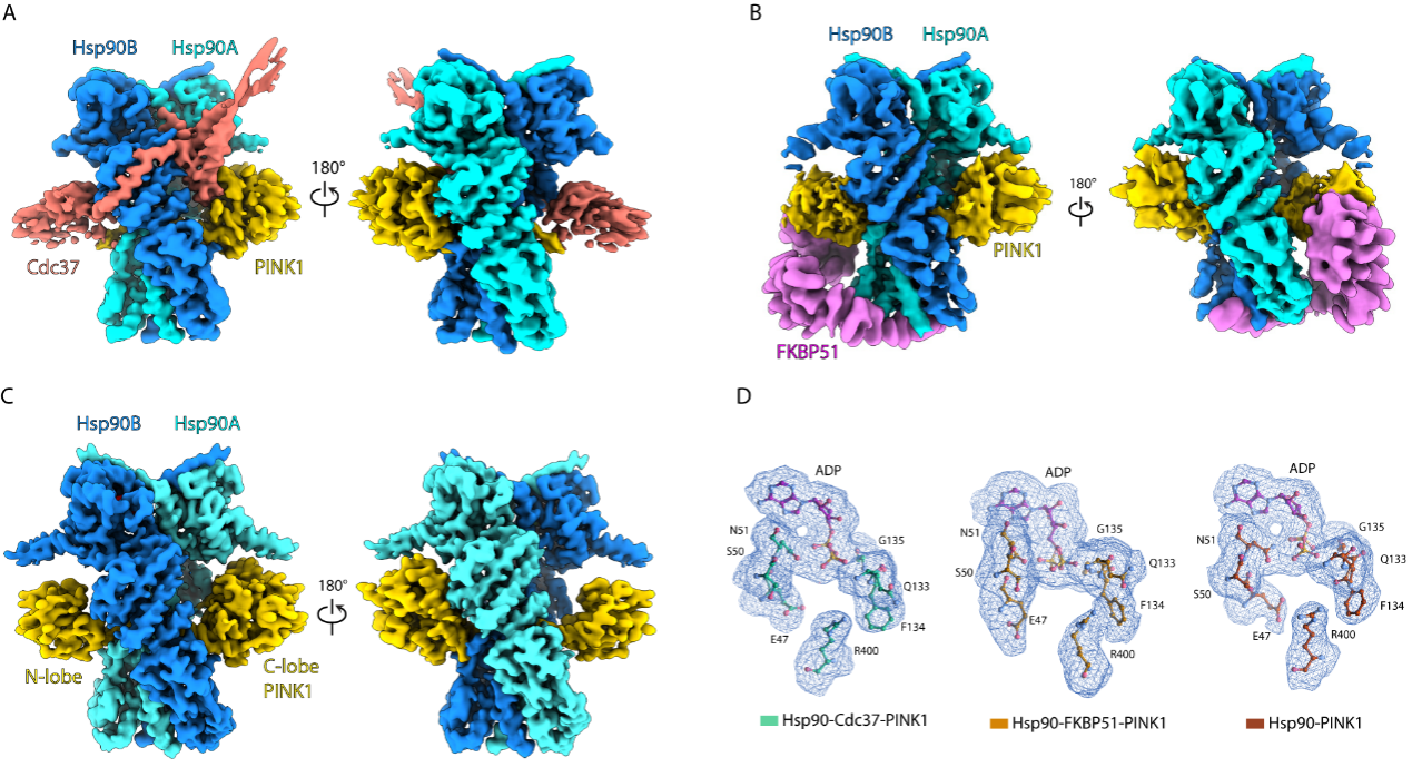 图1.(A)Hsp90-CDC37-PINK1复合物电镜密度图(B)Hsp90-FKBP51-PINK1复合物电镜密度图(C)Hsp90-PINK1复合物电镜密度图(D)复合物中ADP密度图