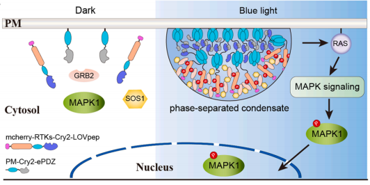 该研究利用两类蓝光敏感蛋白的协同作用,创新性开发出光控相分离系统CORdensate,并通过体系改造实现了生物分子“单体-低阶多聚体-高阶多聚体-相分离”四种组织模式的精准调控。以ALK、RET两种典型RTK为研究对象,研究团队证实,相分离的生物分子组织活性显著优于多聚化。该研究不仅为生物分子相分离功能研究提供了新型光遗传学工具,更为解析相分离调控RTK信号的机制提供了关键实验证据,为靶向RTK异常相分离的疾病治疗奠定了理论基础。
