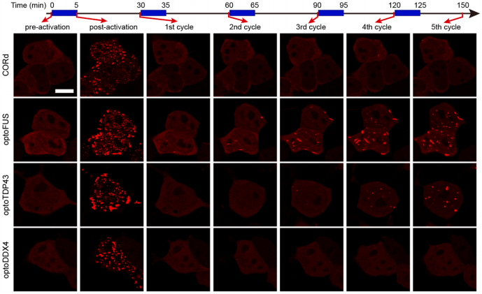 为明确CORdensate的技术特性,研究团队将其与经典光控相分离系统optoDroplet(以optoFUS、optoTDP43和optoDDX4为例)进行系统性比较。结果显示:optoDroplet的相分离行为高度依赖所融合的固有无序区(IDR)蛋白特性 —— 例如optoFUS相较于optoTDP43、optoDDX4更易形成不可逆纤维状聚集体,该异质性可能源于不同IDR与细胞内源性生物分子的互作网络差异。与之相比,CORdensate展现出显著更优的动力学特性:组装过程温和,解聚速率更快,且组装-解聚动力学稳定;即使在强光激活条件下,也不易形成凝胶样不可逆聚集体,有效规避了传统工具的稳定性缺陷(图2)。