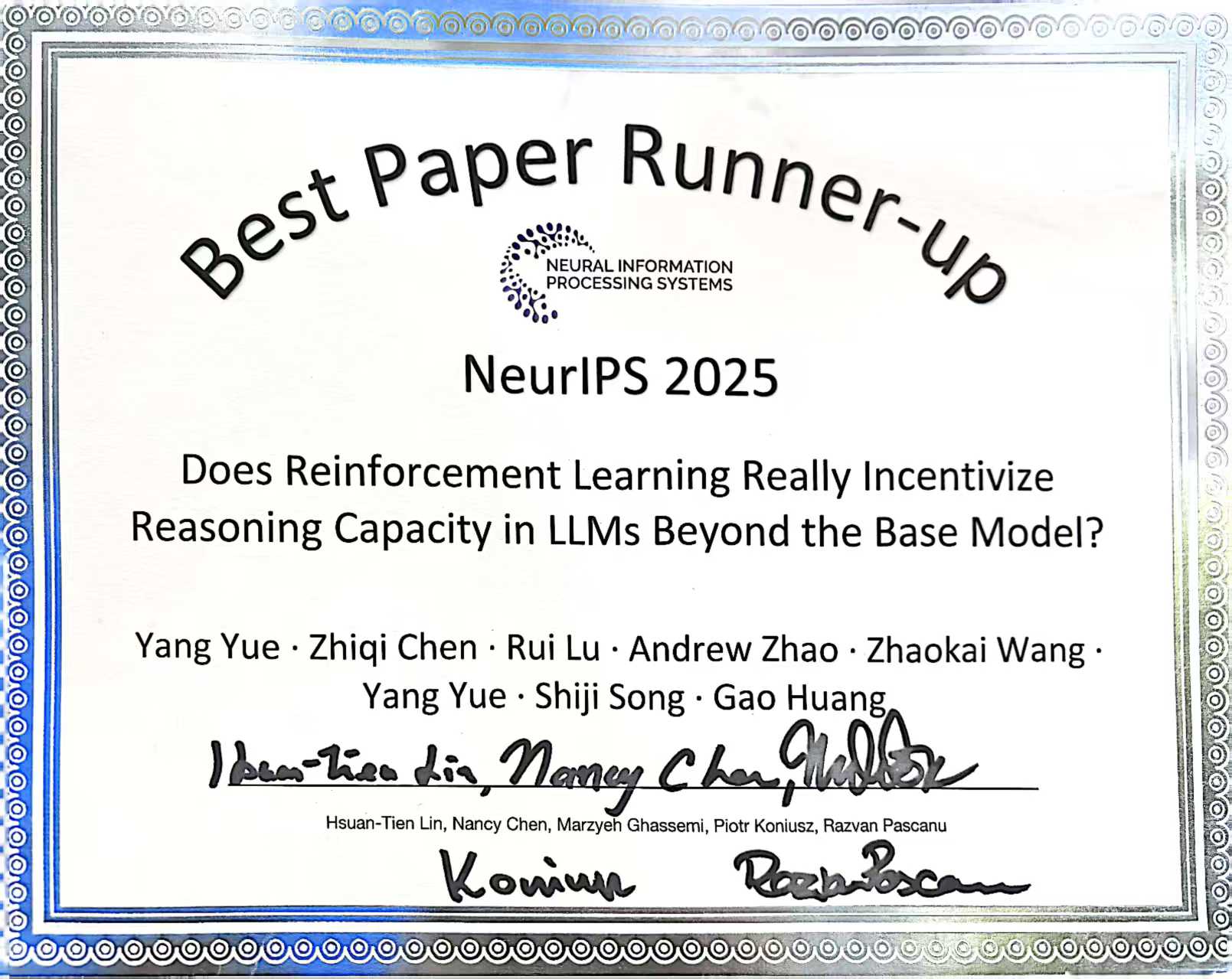 清华新闻网12月12日电 12月6日,在美国圣地亚哥举行的第39届神经信息处理系统会议(Conference on Neural Information Processing Systems,NeurIPS)上,清华大学自动化系宋士吉教授、黄高副教授团队的论文“强化学习是否真的能激发大语言模型产生超越基础模型的推理能力?”(Does reinforcement learning really incentivize reasoning capacity in LLMs beyond the base model?)获得最佳论文亚军奖(Best Paper Runner-Up Award)。