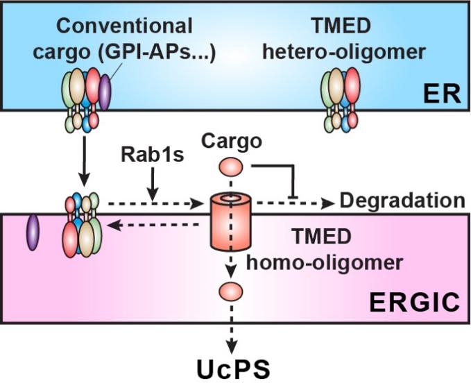 TMED家族可以分成四个亚家族,之前的研究揭示TMED四个亚家族的各一个成员在细胞内可以形成异源四聚体,这对于其自身的稳定性和GPI锚定蛋白从内质网输出至关重要。然而,TMED蛋白在非经典分泌中以同源多聚体发挥功能,这意味着TMED蛋白存在着重要的寡聚化动态转换机制从而实现不同的生物学功能。研究人员通过多种方法揭示了亚细胞定位直接调控TMED蛋白寡聚化转换从而适应其功能转变,在内质网TMED蛋白倾向于形成异源四聚体从而介导特定蛋白(如:GPI锚定蛋白)的经典运输,而在ERGIC上,TMED蛋白受到ERGIC多种特异因子的协同调控,更倾向于形成由非经典货物诱导并稳定的同源寡聚体从而实现货物跨膜转运的功能。这一机制确保了TMED蛋白转运机器的形成和开放只能在特定亚细胞结构和非经典分泌货物存在的条件下,有效避免了对细胞稳态的潜在不利影响(图2)。
