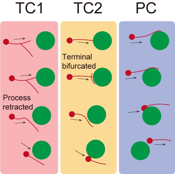 结合活体血管标记技术与IMEE,研究首次实现了对哺乳动物胚胎大脑内神经‑血管‑免疫互作的实时观测。根据抑制性神经元在切向迁移过程中引导突与血管的接触方式,研究团队区分出两类互作模式:末端接触(Terminal contact,TC)与突起接触(Process contact,PC)。结果表明,末端接触会引发神经元引导突分支收缩或新生,从而改变迁移路径以绕过接触对象;而突起接触则允许神经元沿原方向继续迁移,例如沿血管壁“滑动”。