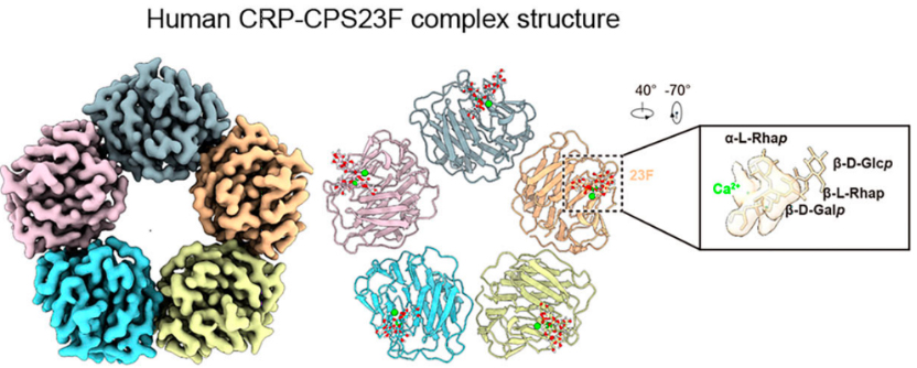 团队利用冷冻电镜技术解析了人CRP与肺炎链球菌23F血清型荚膜多糖的复合物结构,分辨率达到2.78Å。结构分析显示,CRP形成五聚体结构,每个单体包含两个钙离子。荚膜多糖中的磷酸基团与CRP的钙离子配位,形成特异性相互作用。