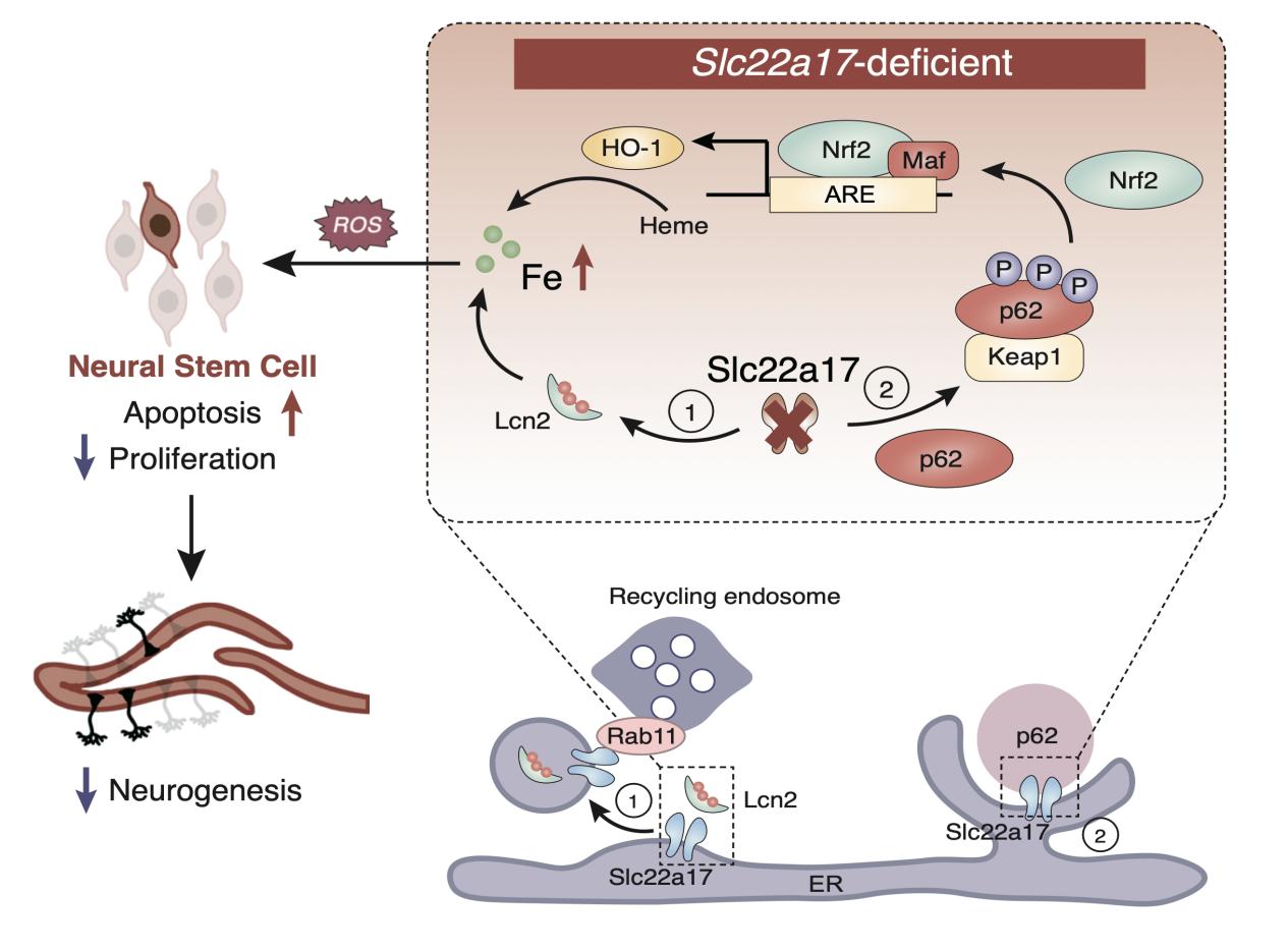 图3. SLC22A17调控铁代谢和神经发生的机制图