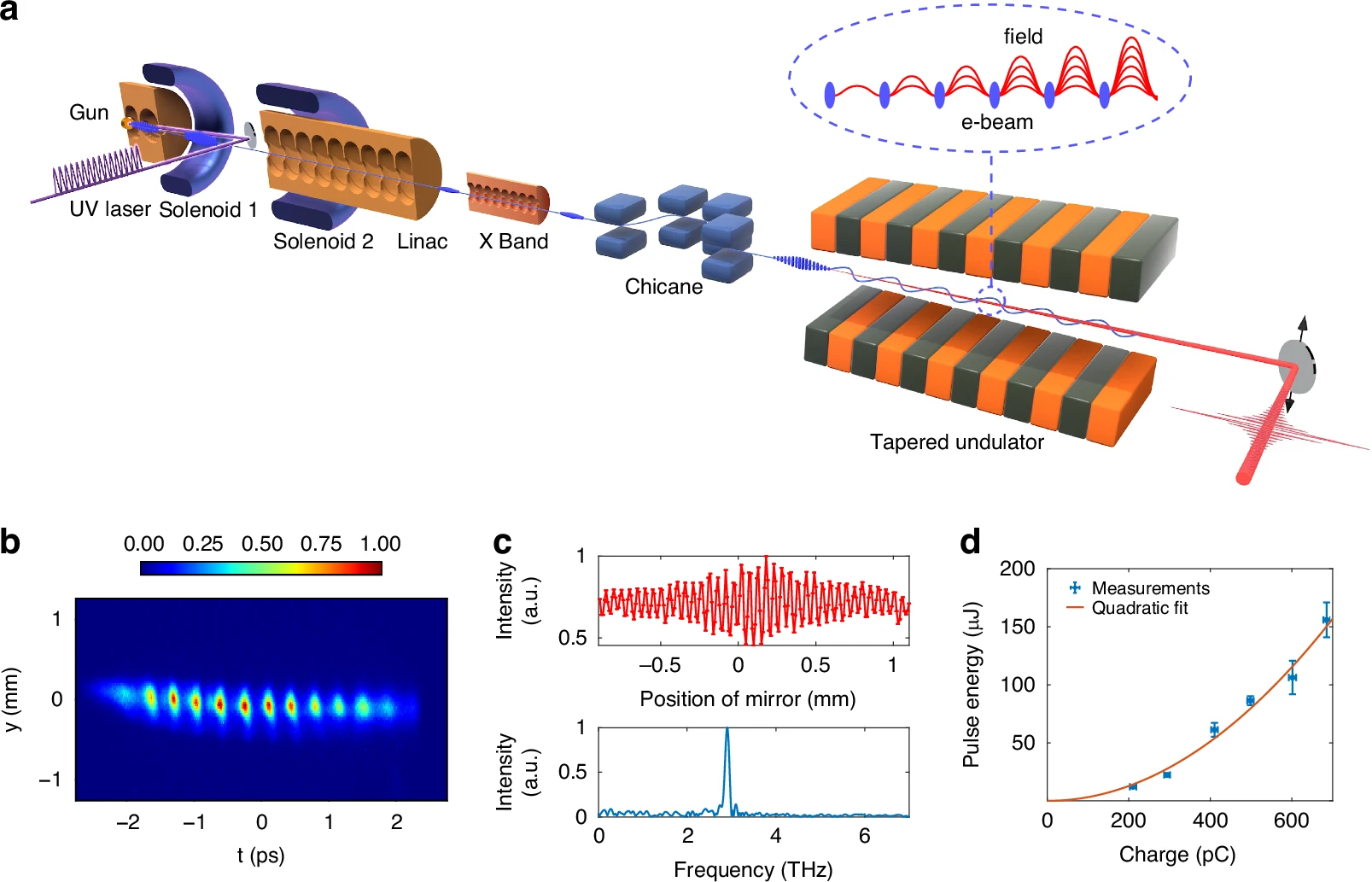 实验装置布局如图1a所示,利用脉冲堆积产生的准平顶紫外激光脉冲串照射在光阴极上,产生具有初始密度调制的电子束脉冲串,随后经过空间电荷振荡过程转化为周期性能量调制,并在后续传输过程中不断加深。通过后续的加速管和X波段谐波腔,可以调整电子束的能量和能量啁啾,下游的磁压缩器将电子束的能量啁啾转化为目标频率的密度调制,并输送到波荡器中驱动超辐射自由电子激光。图1b至1d分别展示了通过偏转腔测量的电子束纵向密度调制、辐射频谱特性以及辐射脉冲能量随电荷量平方增长的关系。这些结果不仅验证了辐射的相干性,也表明通过提高电荷量,可进一步提升辐射能量。