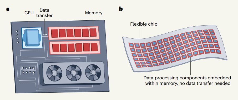 图5.Nature News & Views中对本工作柔性存算芯片与传统计算机硬件的对比
